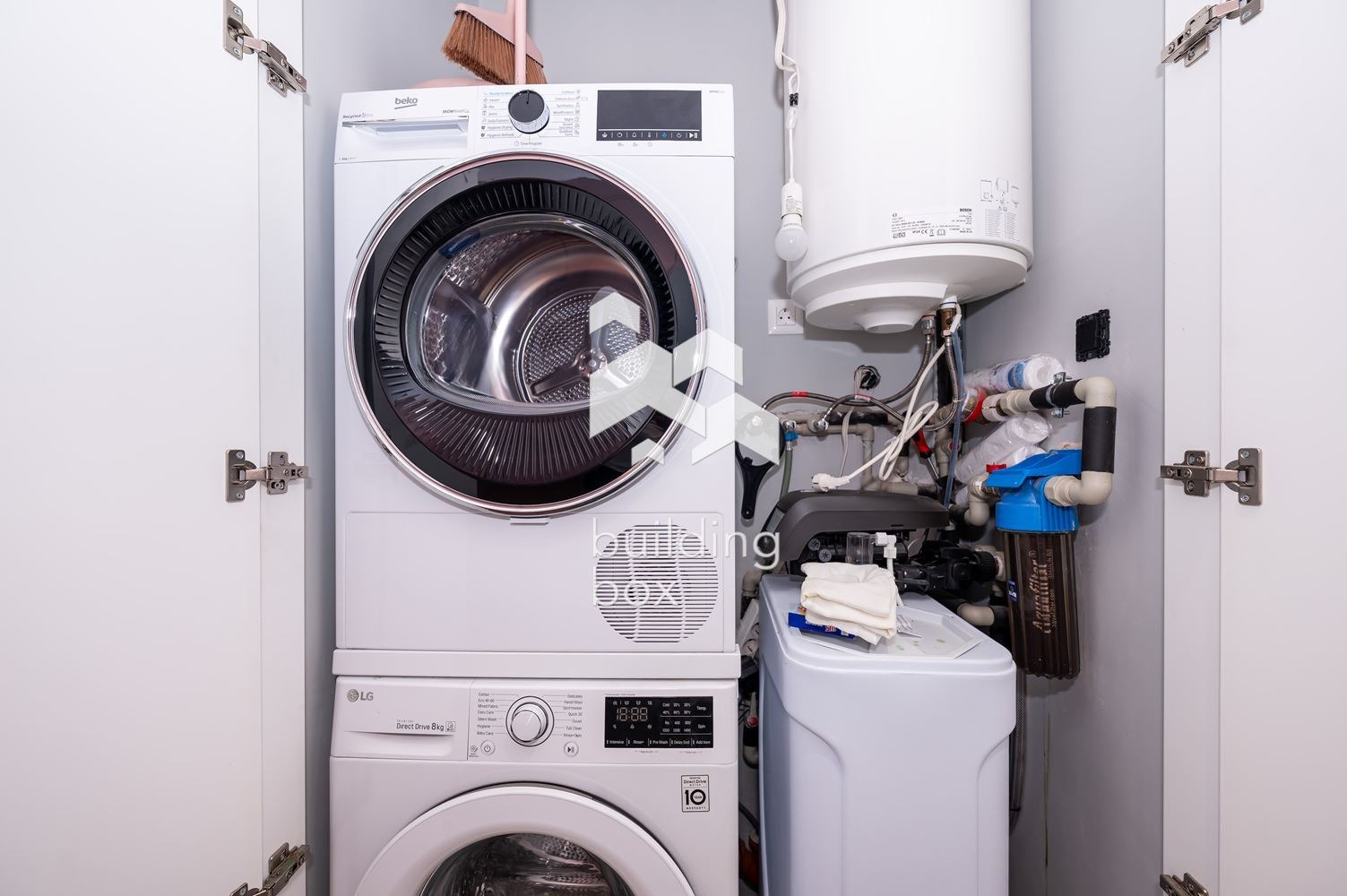 * В коридора умно обособено складово помещение, в което са прибрани пералнята, сушилнята и система за пречистване на водата.