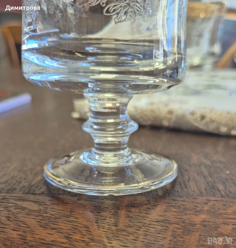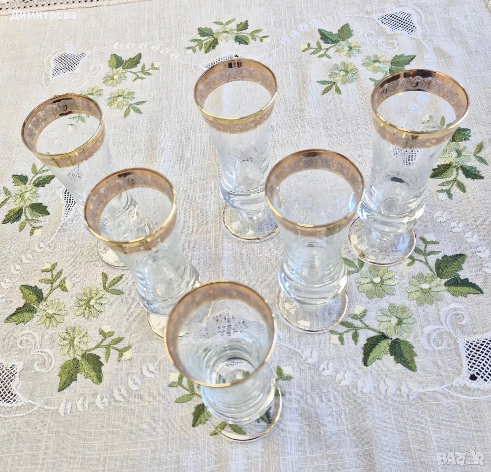 Като забележка ще посоча незначително износване по позлатата, която "прозира" срещу светлината, иначе не личи особено. На две от чашите има фабрични мехурчета на дъното и една мини черна точица ( снимала съм подробно).