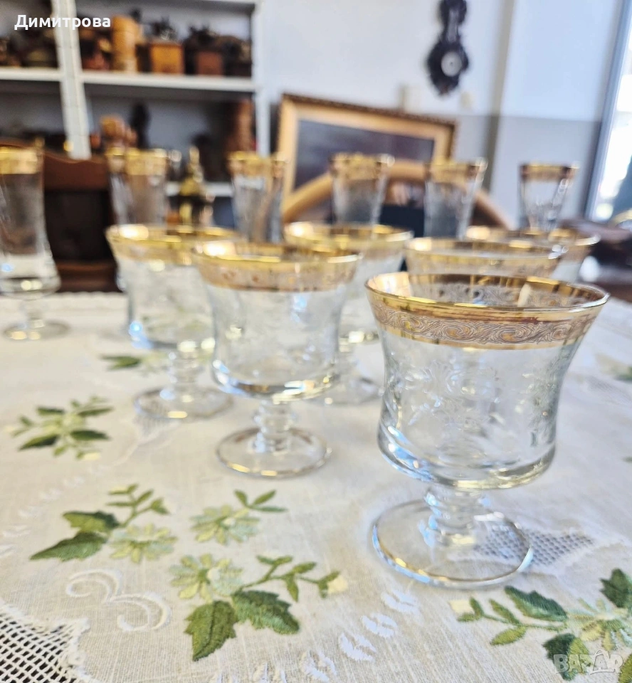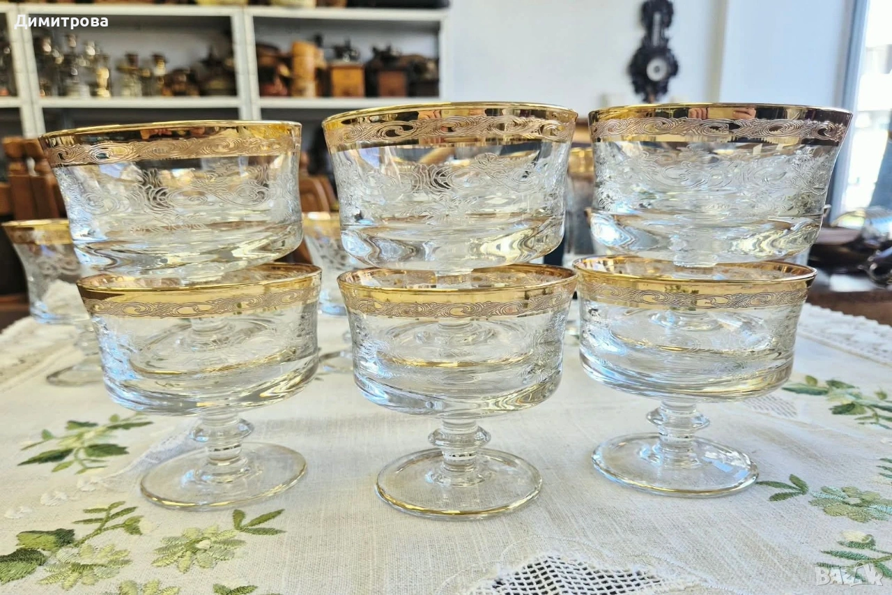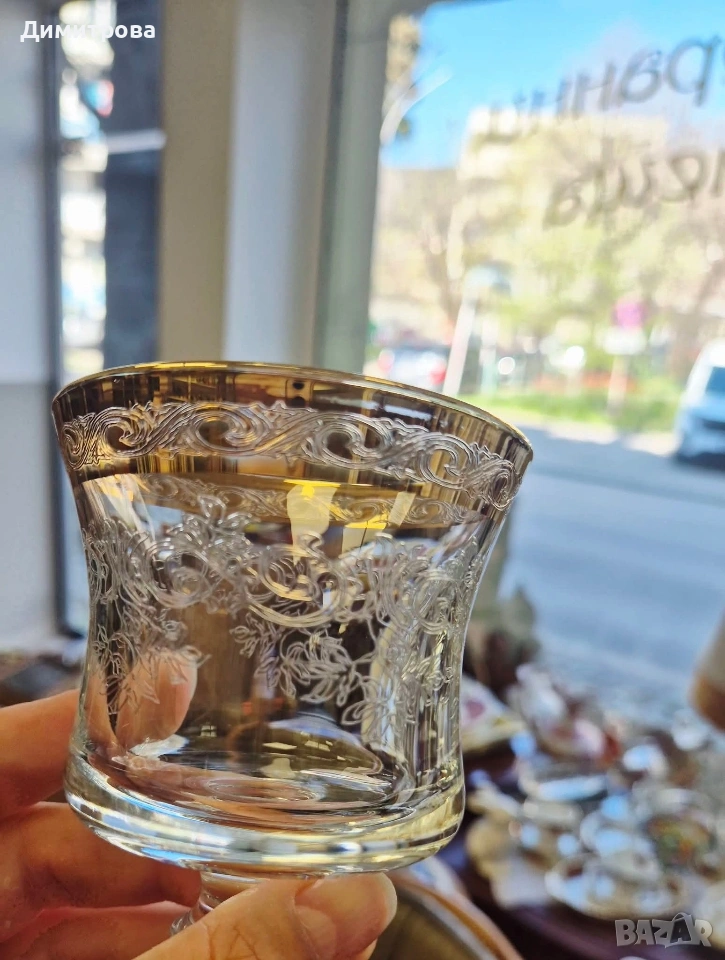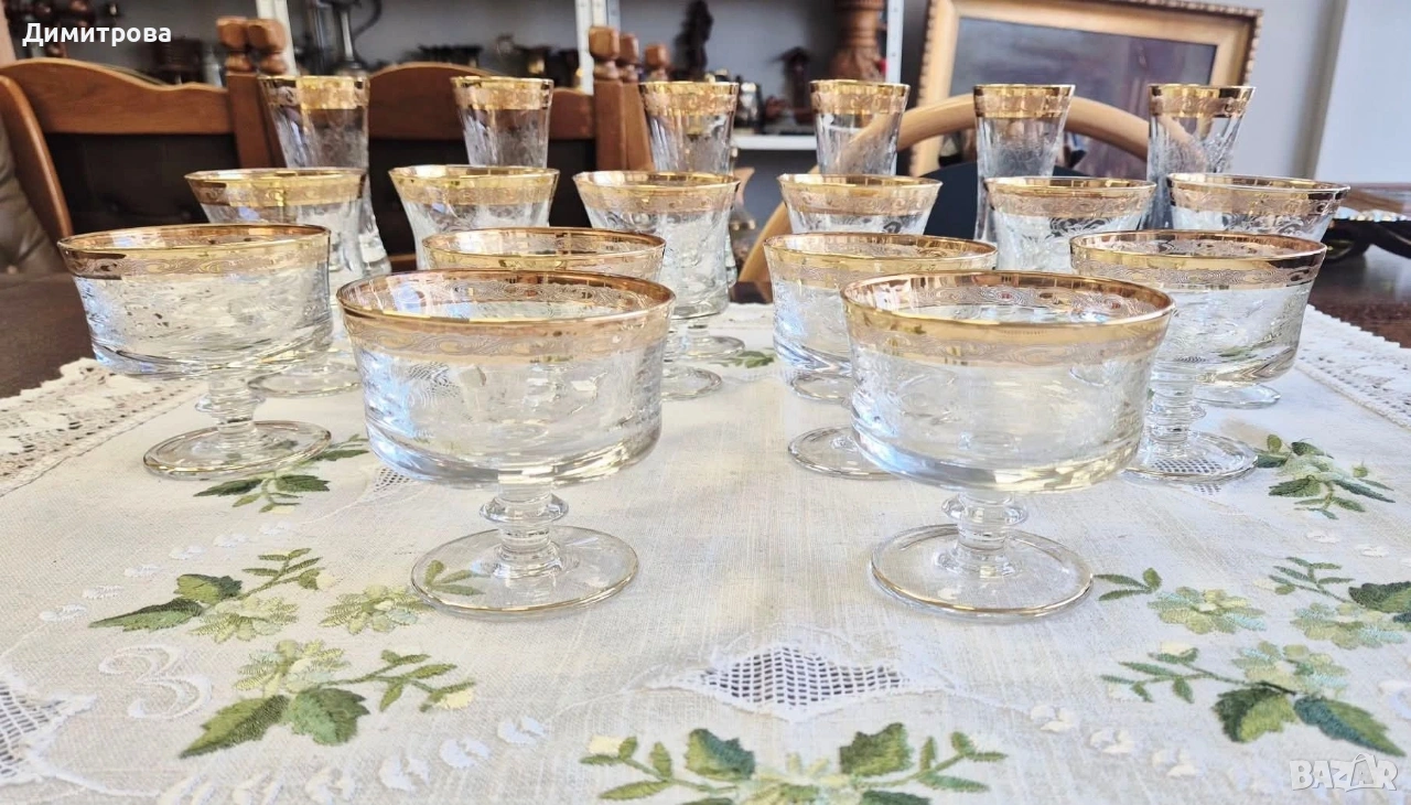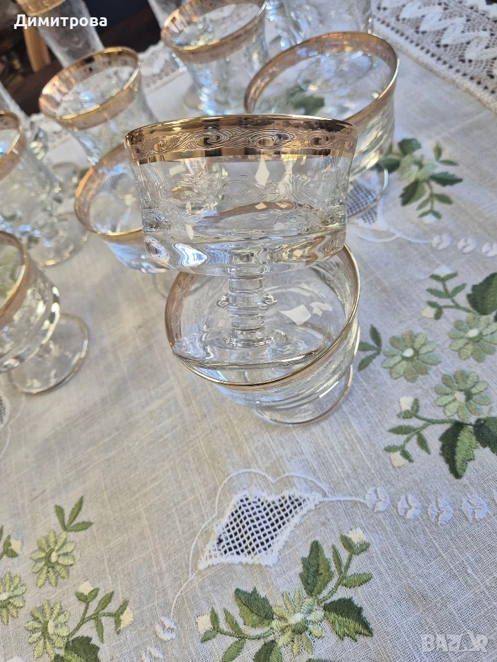 Произвеждани през 60- те години на миналия век. Ръчно нанесена фина флорална гравюра, като паяжина и плътна широка 24 каратова позлата.