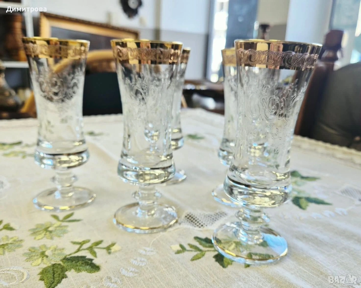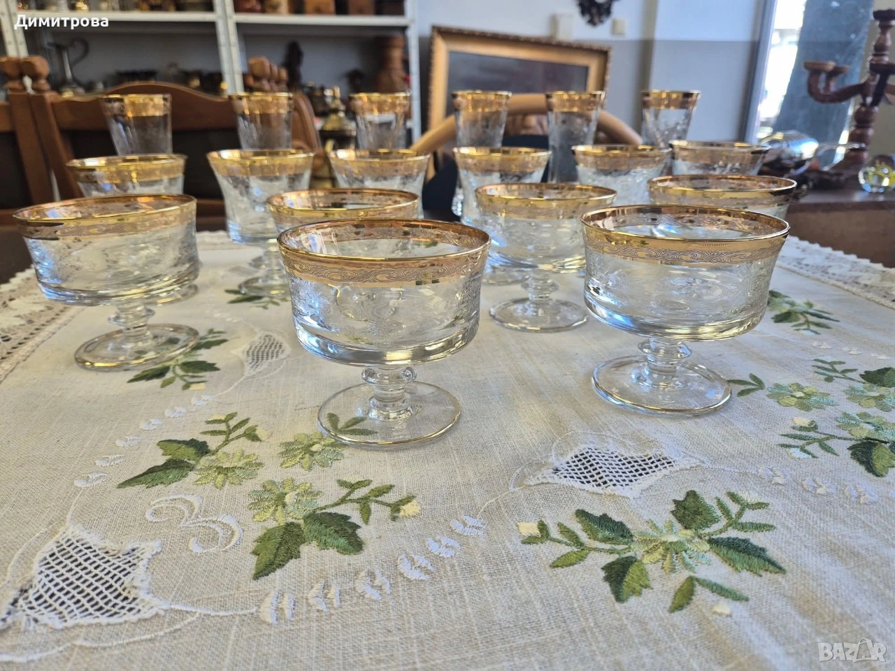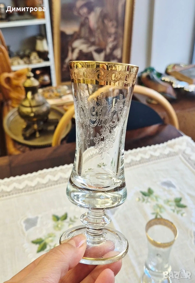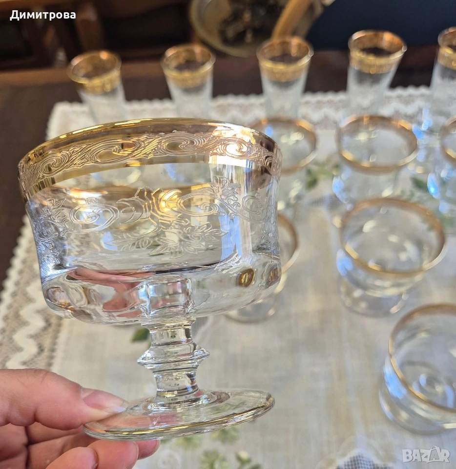 Произвеждани през 60- те години на миналия век. Ръчно нанесена фина флорална гравюра, като паяжина и плътна широка 24 каратова позлата.