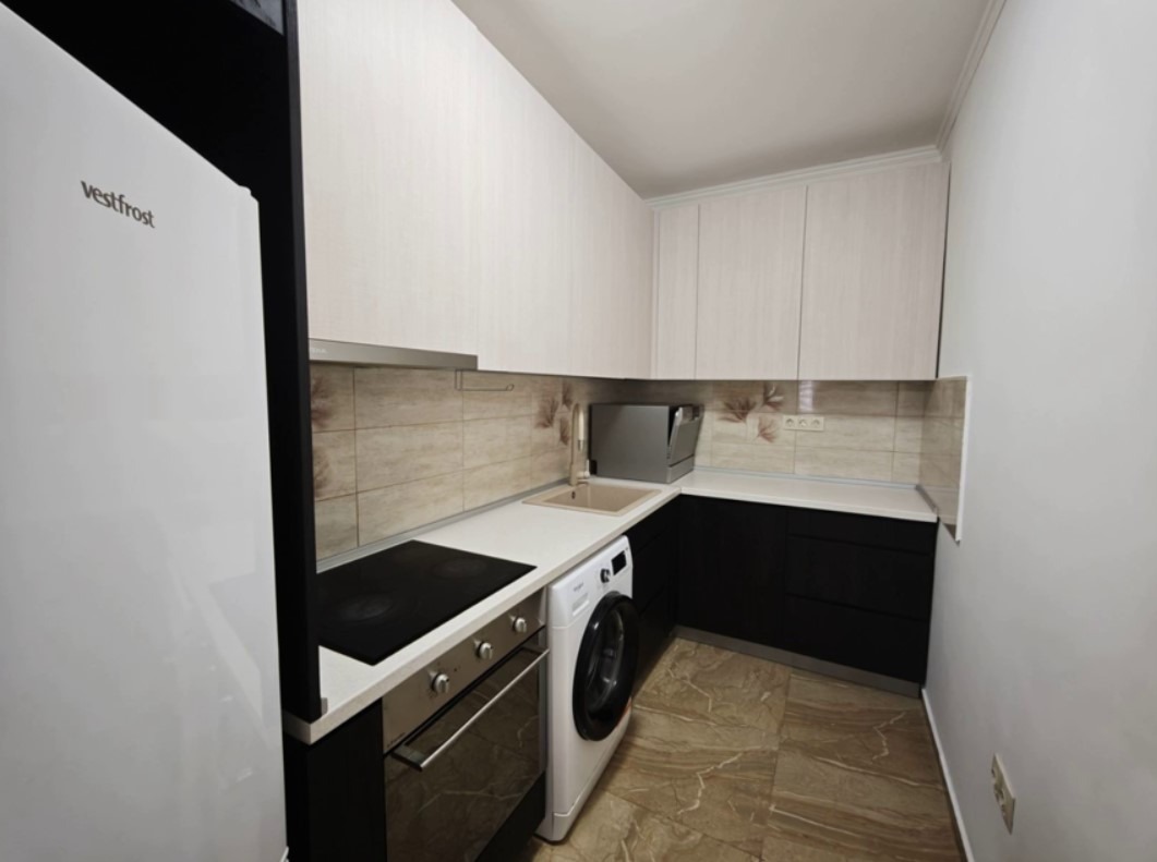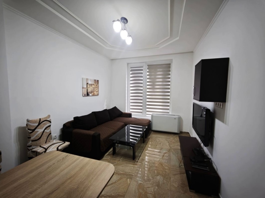 Имотът е обзаведен, с площ 45 кв.м, на 1-ви от 4 етажа в сграда с асансьор. Разпределението включва входно антре, хол с кухня и трапезария, спалня, баня с тоалетна и тераса.
