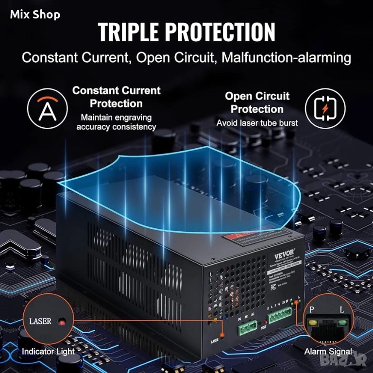 Защита: Конфигурацията на защита от постоянен ток и защита от отворена верига осигурява постоянна точност на гравьорите или резачите. Защитата от отворена верига може да се изключи автоматично при претоварване на машината, за да се гарантира сигурността на оборудването и същевременно да се избегне опасността от спукване на лазерната тръба.