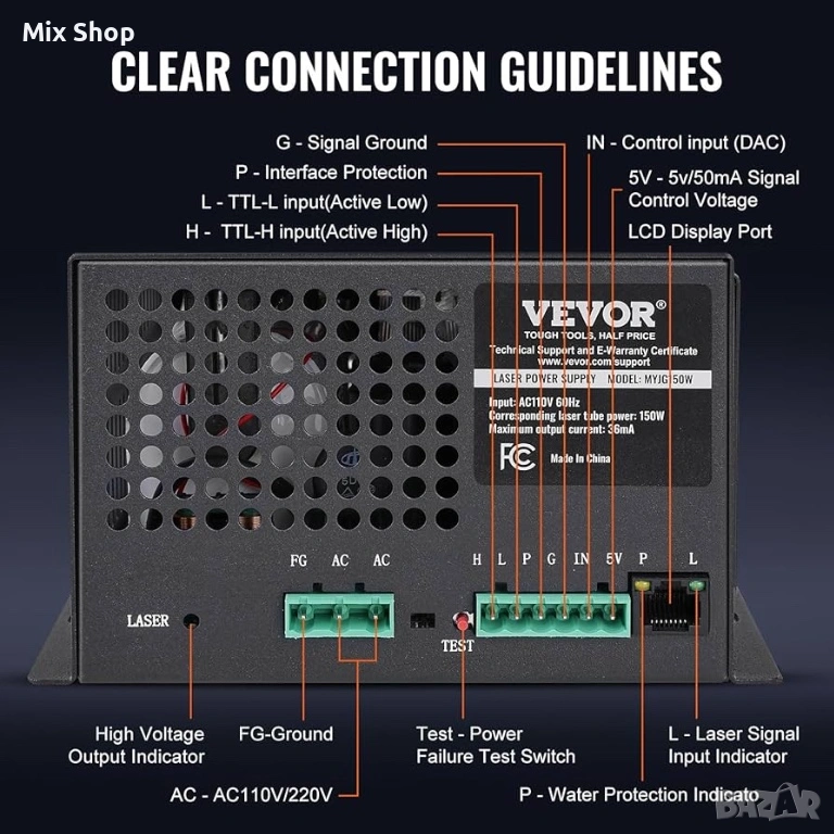 захранване, специално създадено за лазерно гравираща машина, е напълно съвместимо с различни марки лазерни тръби 150W. Портовете са ясно обозначени със съответните етикети, така че можете лесно да извършите връзката съгласно указанията.