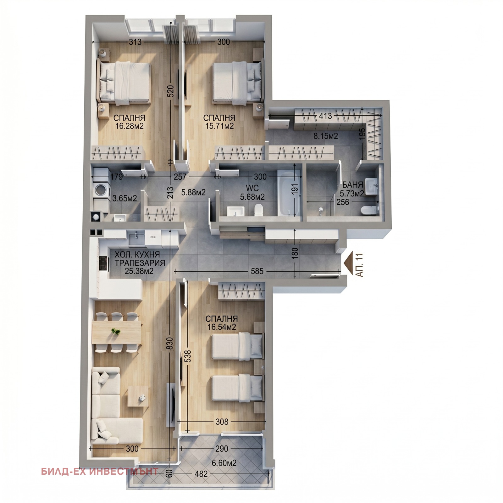 Разпределение на апартамента: Входно антре 10 кв., хол с кухненски бокс и трапезария 25.40 кв., детска стая 16.54 кв., мокро помещение 3.65 кв., спалня 15.71 кв. към нея гардеробна 8.15 кв. и баня с тоалетна 5.74 кв., спалня 16.28 кв. и тераса 6.60 кв.