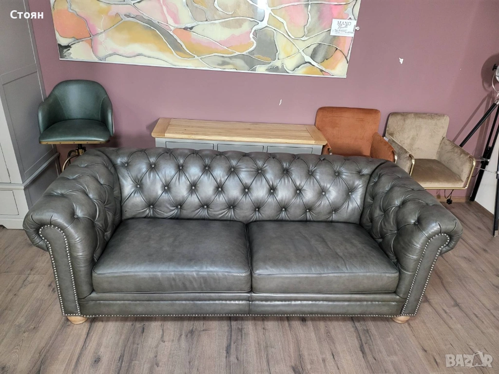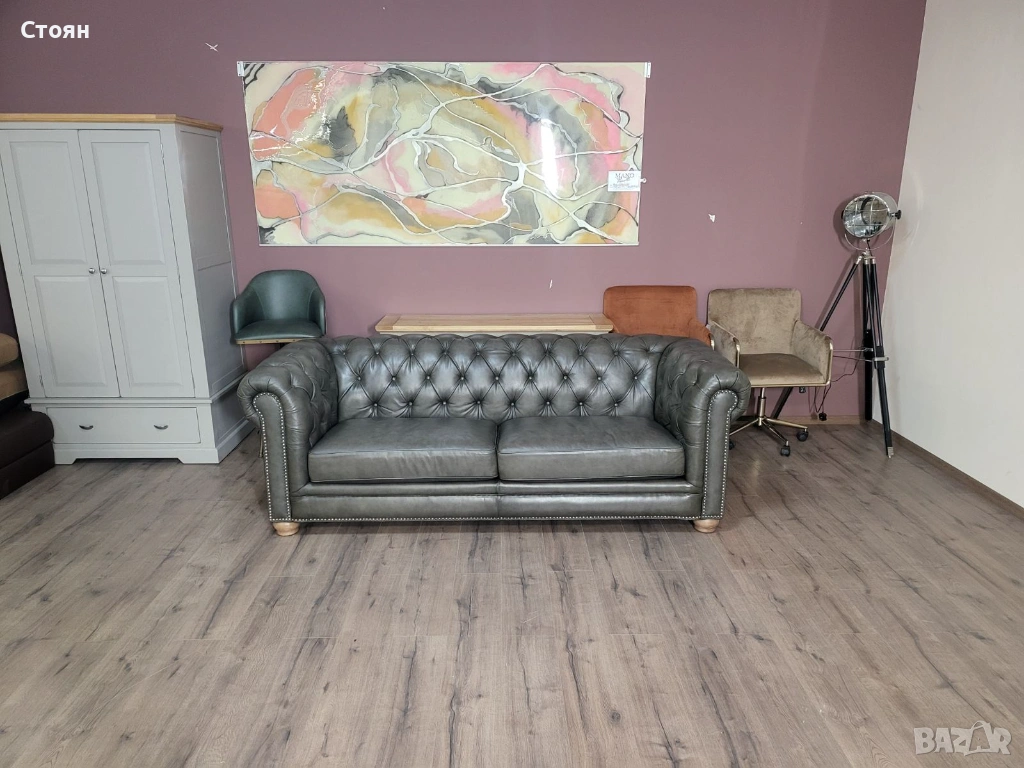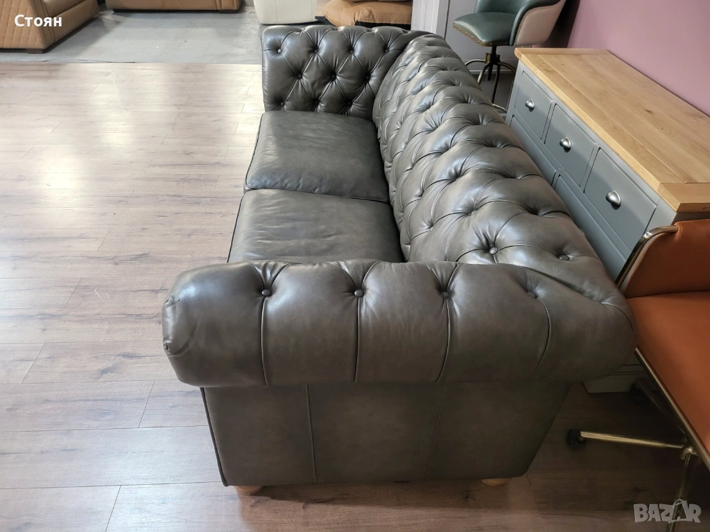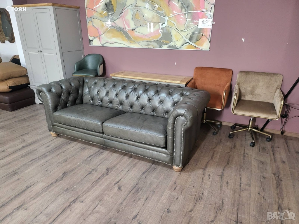 Сиво - зелен кожен диван тройка тип Честърфийлд