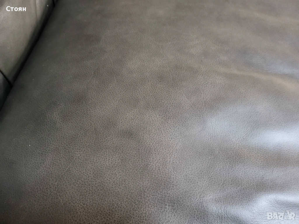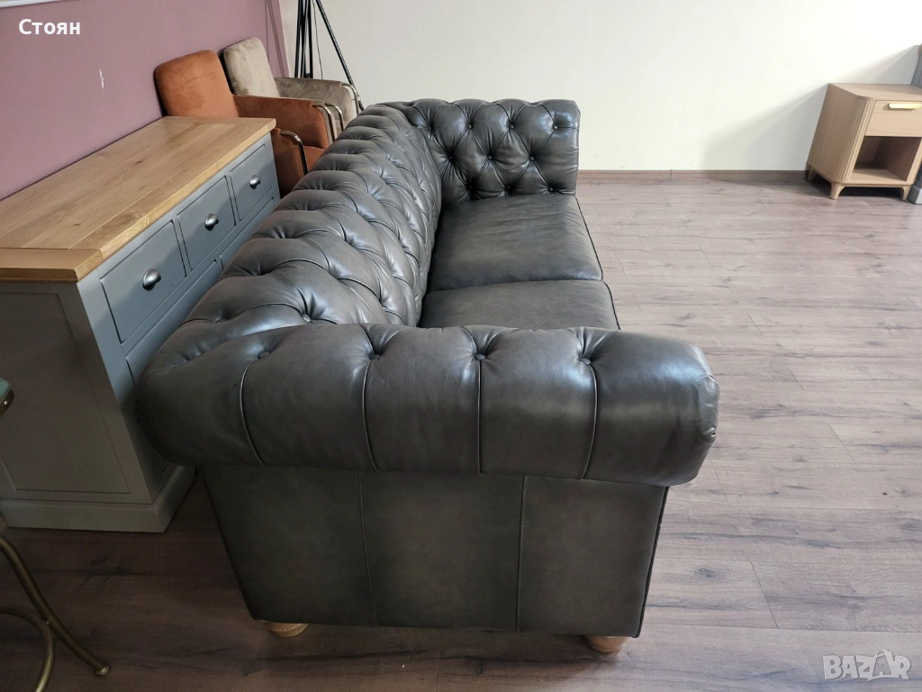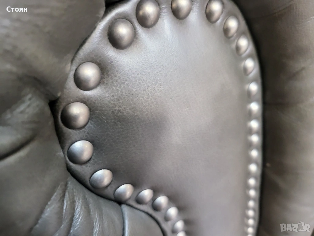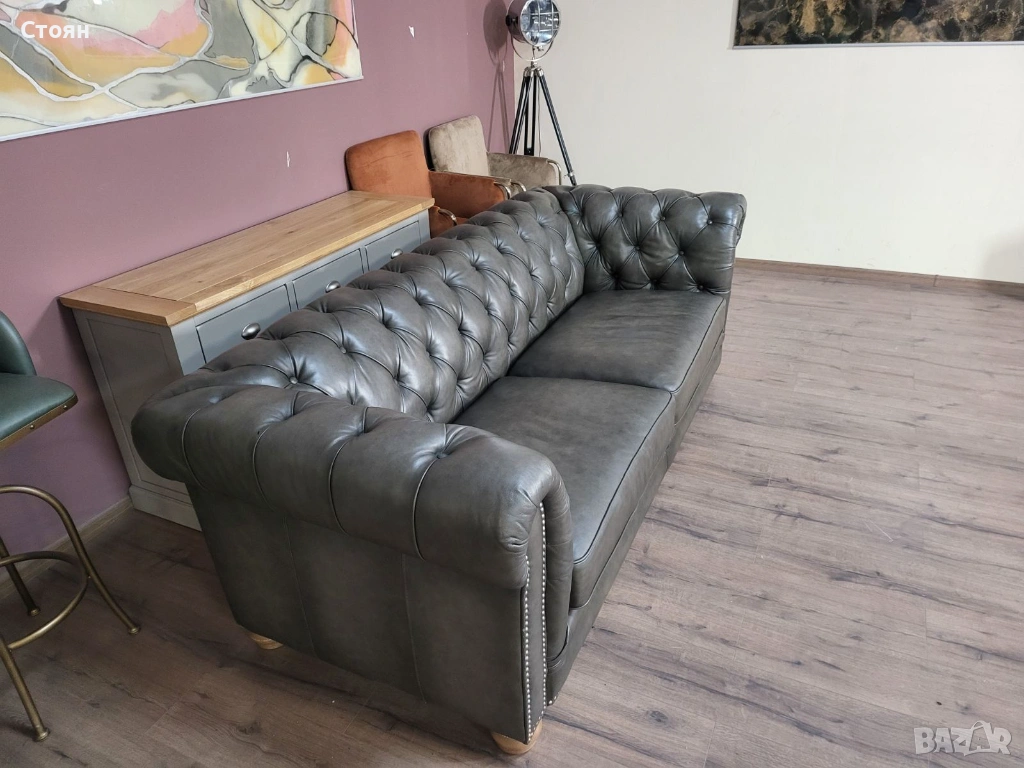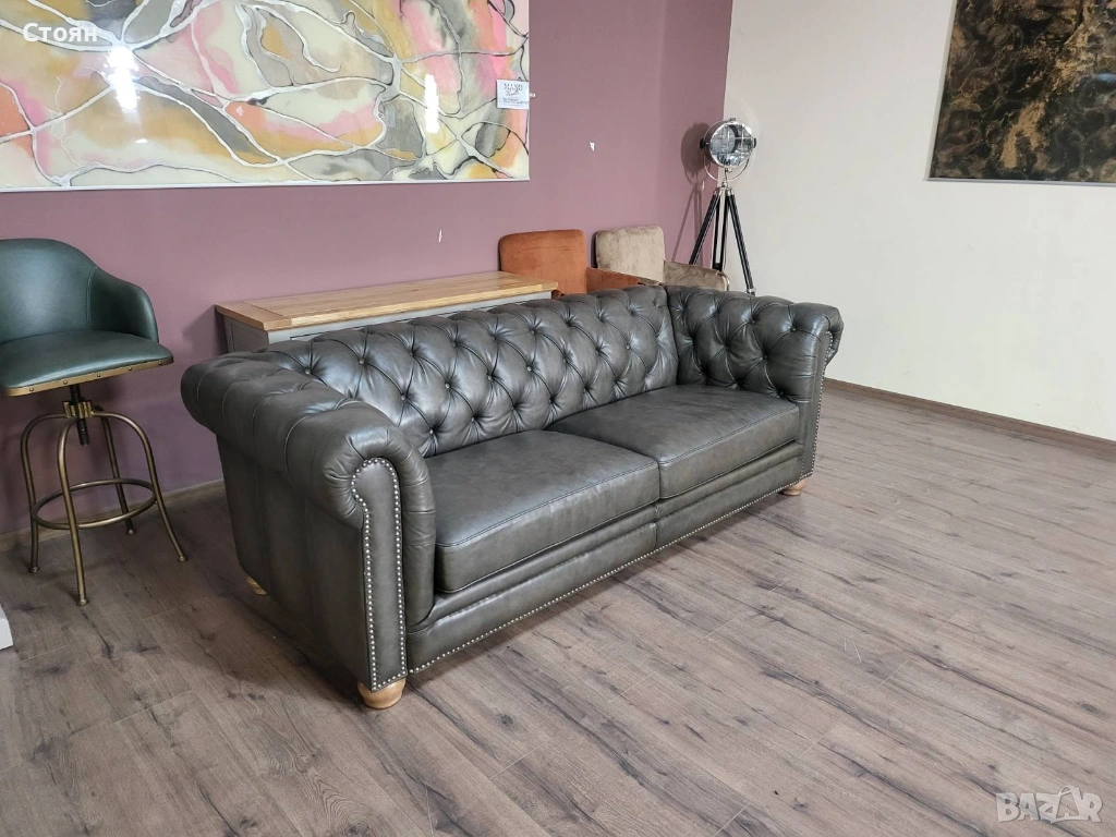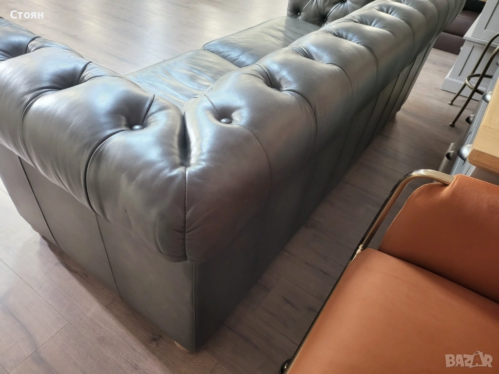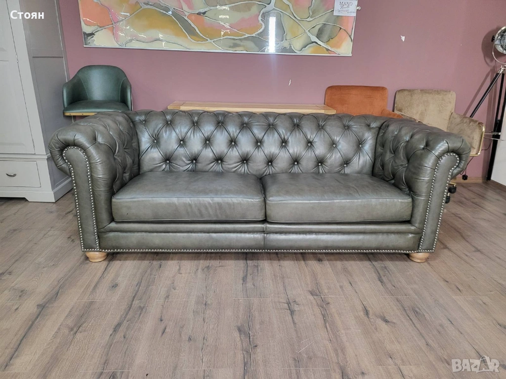 Сиво - зелен кожен диван тройка тип Честърфийлд → Обява 54289085