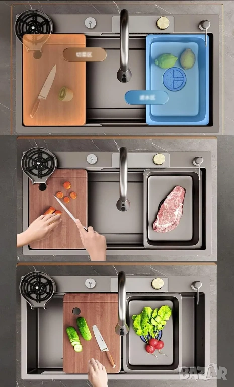 Висококачествена мултифункционална мивка от неръждаема стомана. Създава многофункционално работно пространство, за да можете удобно да миете плодове и зеленчуци с нейния
