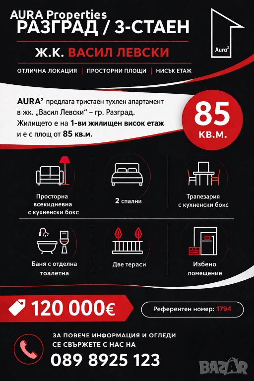 AURA Properties предлага на Вашето внимание тристаен тухлен апартамент, находящ се в жк."Васил Левски"- гр.Разград. Жилището се намира на 1-ви жилищен висок етаж и е с площ от 85кв.м. Състои се от входно антре, просторна всекидневна, трапезария с кухненски бокс, 2 спални, баня с отделна тоалетна и две тераси. Отоплението е на климатик. Жилището е със сменена дограма. Към имота има и прилежащо избено помещение.