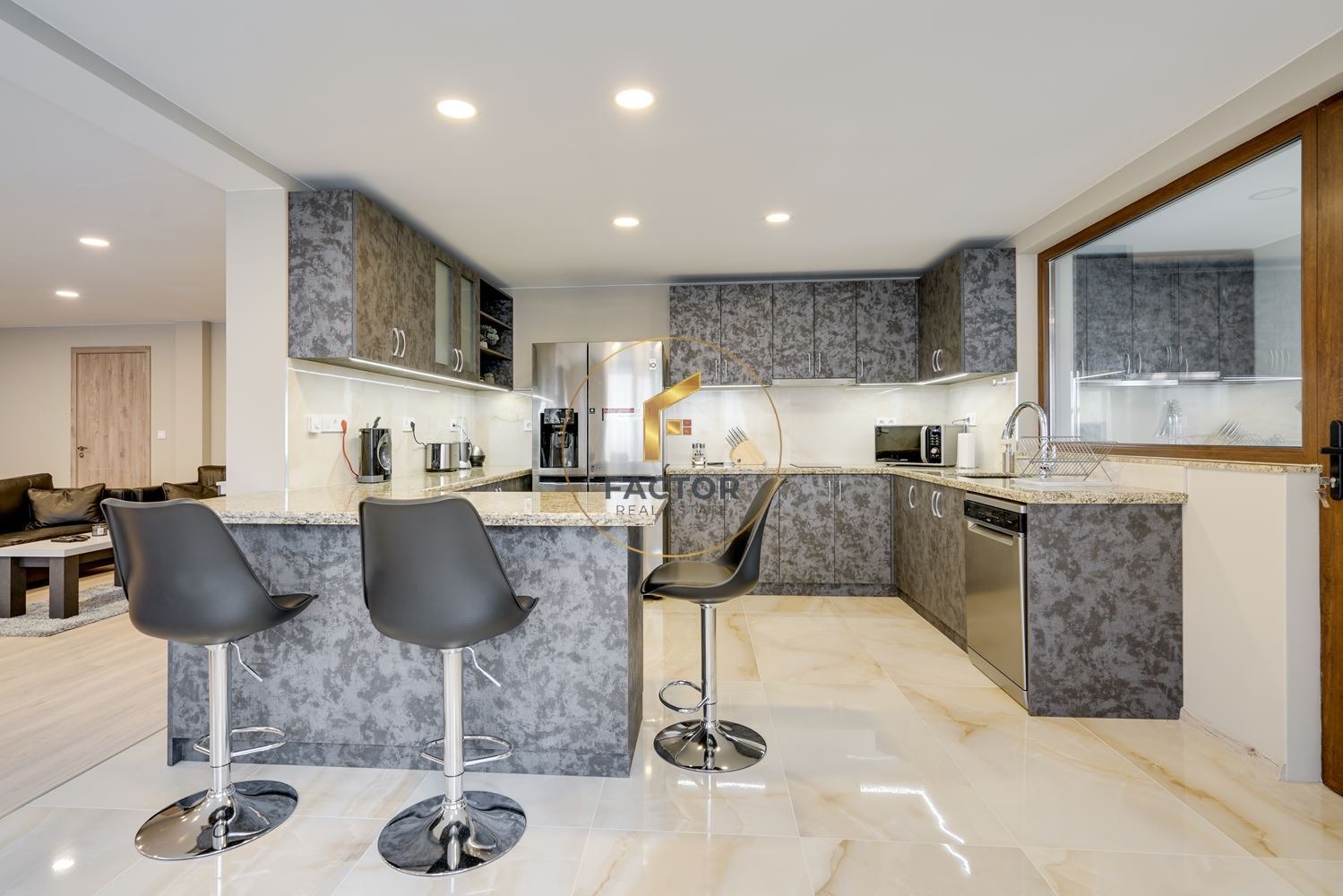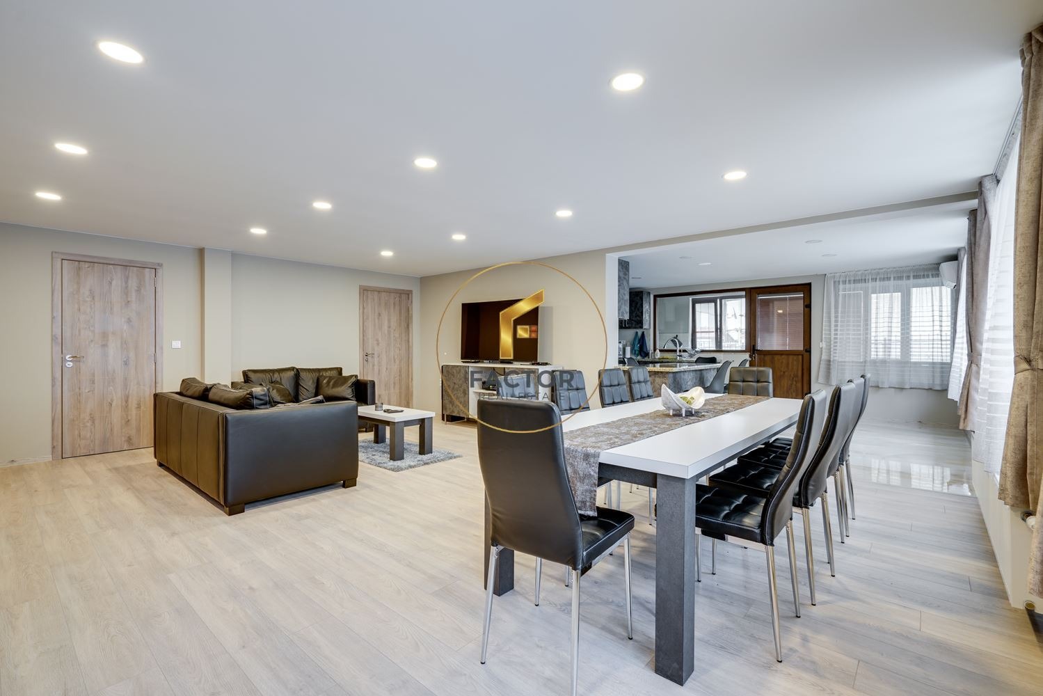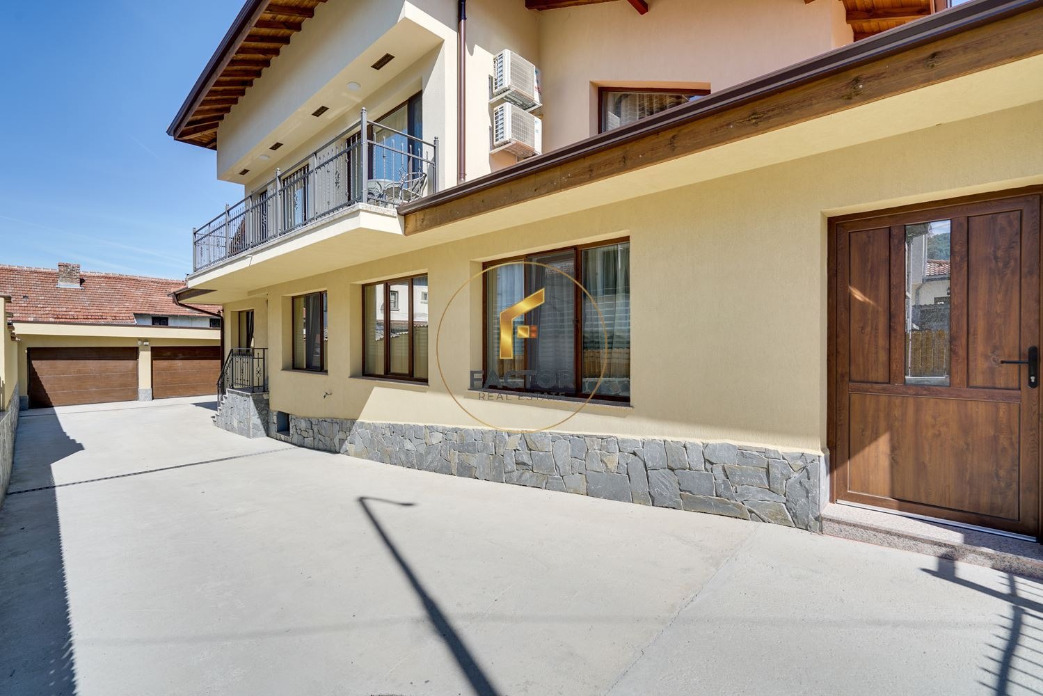 Първи етаж: Огромен дневен тракт, разделен на кътове: кухненска част, кът за сядане с телевизор и мека мебел, трапезарна маса за 10 човека, тоалетна към дневния тракт. Пред кухненската част има предверие, в което е изнесена също външна кухня. На етажа са разположени три спални, напълно обзаведени и оборудвани, всяка със собствена баня и тоалетна. В коридора е разположено перално помещение, оборудвано с пералня и сушилня. Площ на етажа:190 кв.м