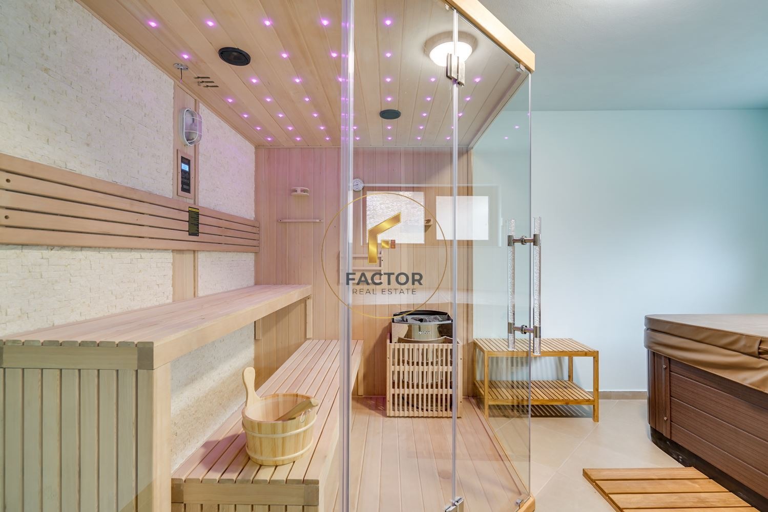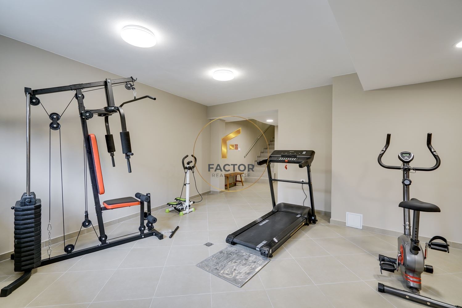 Сутеренен етаж: Фитнес зала, сауна, джакузи, котелно помещение. Площ на етажа 75 кв.м