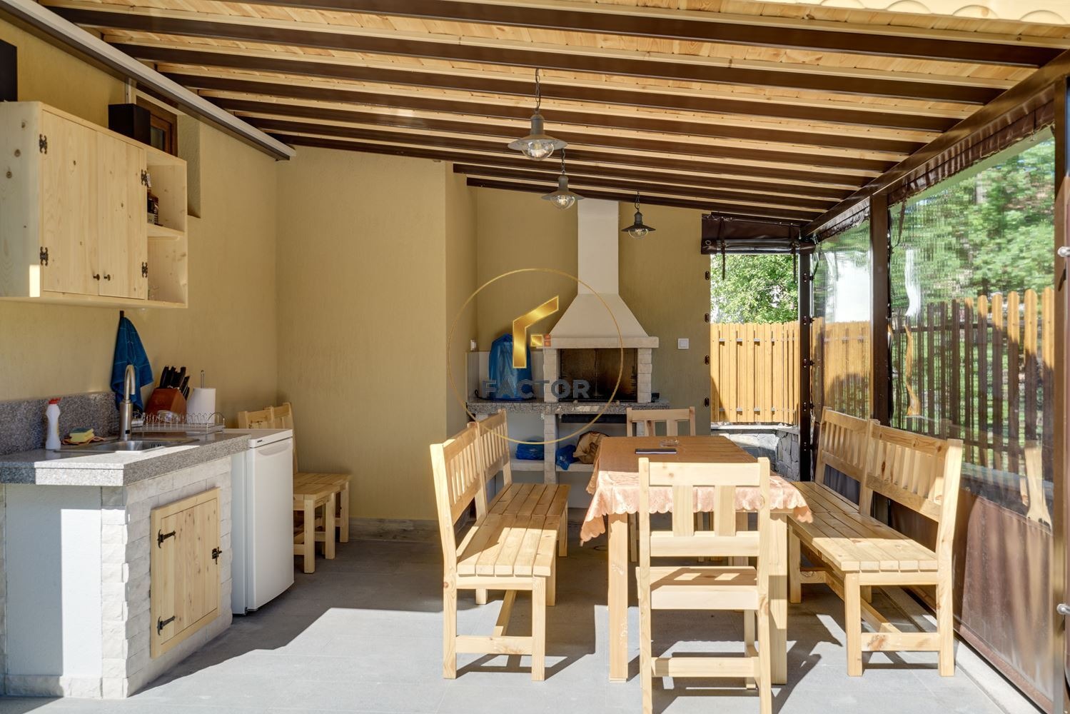 В двора на хотела са разположени: двоен закрит гараж, покрита барбекю зона с кухненски шкафове, пещ за барбекю, маса за 10 човека и санитарен възел.