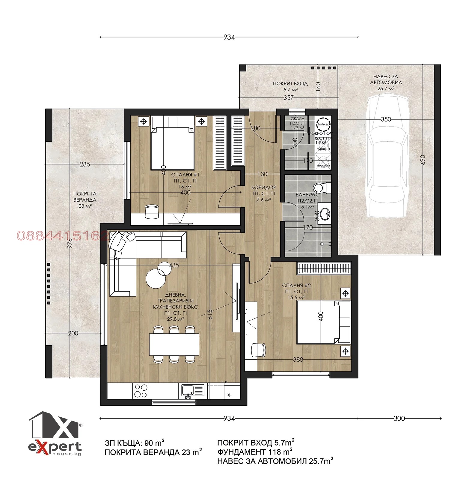 Посочената къща е едноетажна от 90 кв.м с две спални и една баня.