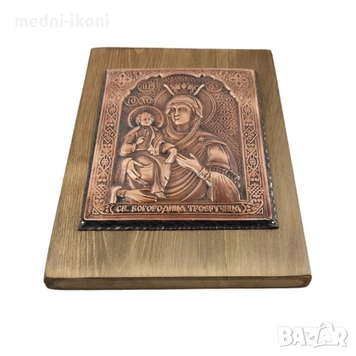 Иконата е ръчно изработена от чиста медна ламарина. Сложена е върху дъска от липа, която е байцвана в цвят "орех". Тази иконата на Божията Майка получава своето име Троеручица през VIII век. По това време в Сирия живее Свети Йоан Дамаскин, висш сановник в двора на дамаския халиф, който се смятало, че трябва да изобличава еретиците. Халифът заповядва да отсекат дясната ръка до китката на преподобния Йоан и за назидание да я окачат на градския площад. Свети Йоан измолва отсечената си ръка, допира я към китката си и пада на колене пред икона на Божията Майка. След дълга молитва той задрямва и точно тогава му се явява чудотворната Света Богородица, която му казва: "Ето, ти си здрав. Труди се прилежно с изцелената си ръка за славата Божия!". Когато Свети Йоан се събужда, вижда ръката си невредима и напълно здрава. От благодарност за станалото чудо той поръчва да прикрепят към иконата на Божията Майка сребърно изображение на отсечената ръка. И така, тази знаменита икона получава названието "Троеручица". Славата на този чудотворен образ на Богородица е разнесен на длъж и шир, защото непрекъснато дарява изцеление и благодат. Света Богородица също е покровителка на дома и семейството, пази майките, децата и родилките, носи успех и светлина в живота. Подходящ подарък е за младо семейство, за сватба, нов дом, освещаване, за раждане на дете, за кръщене, както и за всеки повод, в който искаме да поднесем нещо толкова свято и чудотворно. Носи здраве, сила, подкрепа, благоденствие. Помага също при преминаването на всякакви трудности в живота. Тази специална медна икона е уникат, притежава сертификат за автентичност, не е културна ценност и може да бъде изнасяна извън страната.