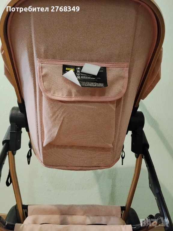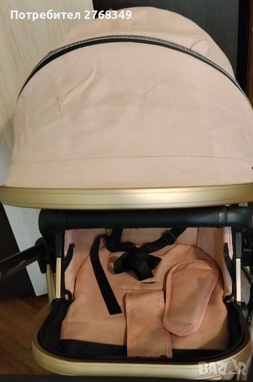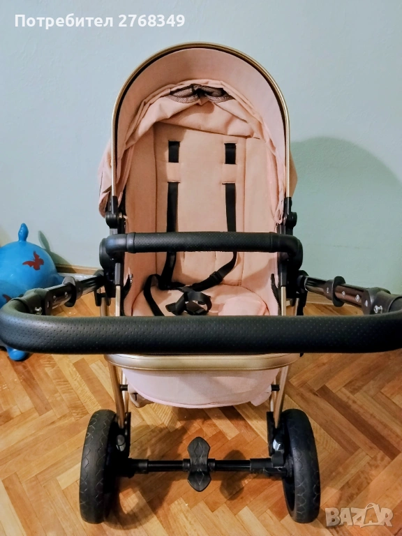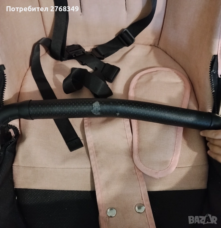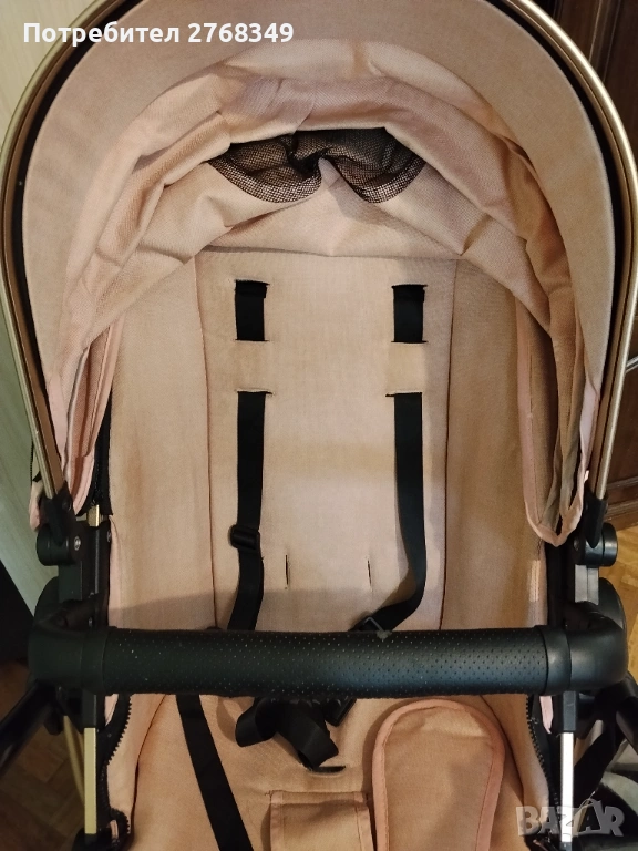 Возилото има голям слънцезащитен сенник с цип и мрежест прозорец, подплатен преден борд и 5-точков предпазен колан.