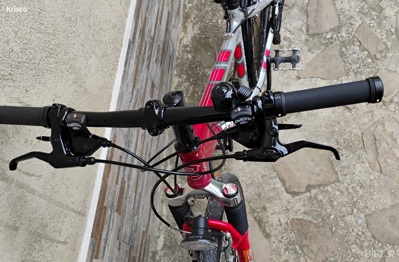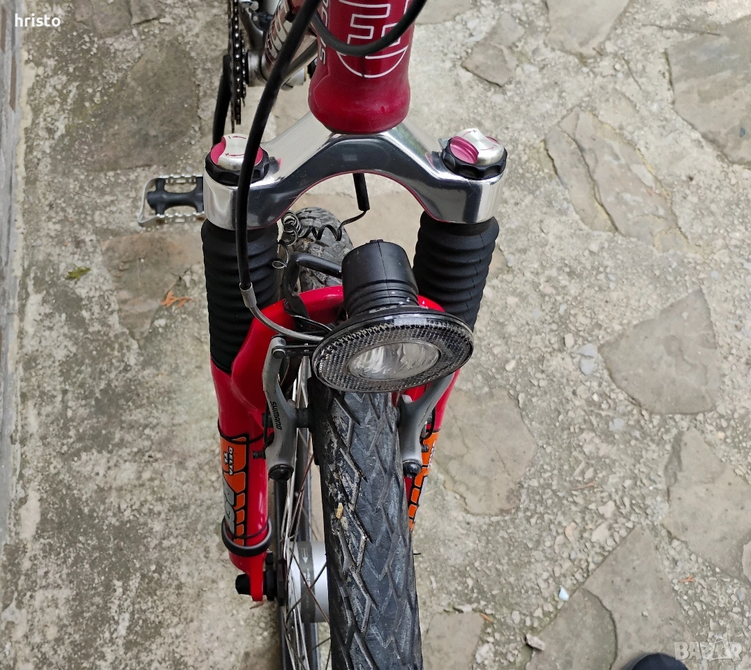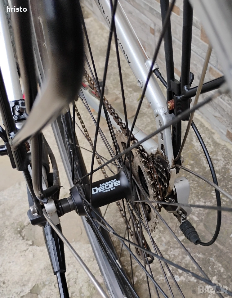 Здравейте, предлагам ви градски велосипед в добро техническо състояние подходящ за ръст 1.50-1.70 м. Колелото е с високо ниво на оборудване - алуминиева рамка, алуминиева амортисьорна вилка с регулиране на твърдостта, алуминиеви двустенни капли, алуминиева задна главина SHIMANO DEORE, предна динамо главина SHIMANO която подава ток на светлините отпред и отзад,алуминиеви курбели SHIMANO, команди SHIMANO DEORE 3×9( общо 27 скорости), заден дерайльор SHIMANO DEORE LX, алуминиева степенка, калници, багажник , алуминиево кормило, алуминиево колче за седалка и т.н. намира се в град Варна, възможен е лек коментар на цената,която е 130 евро