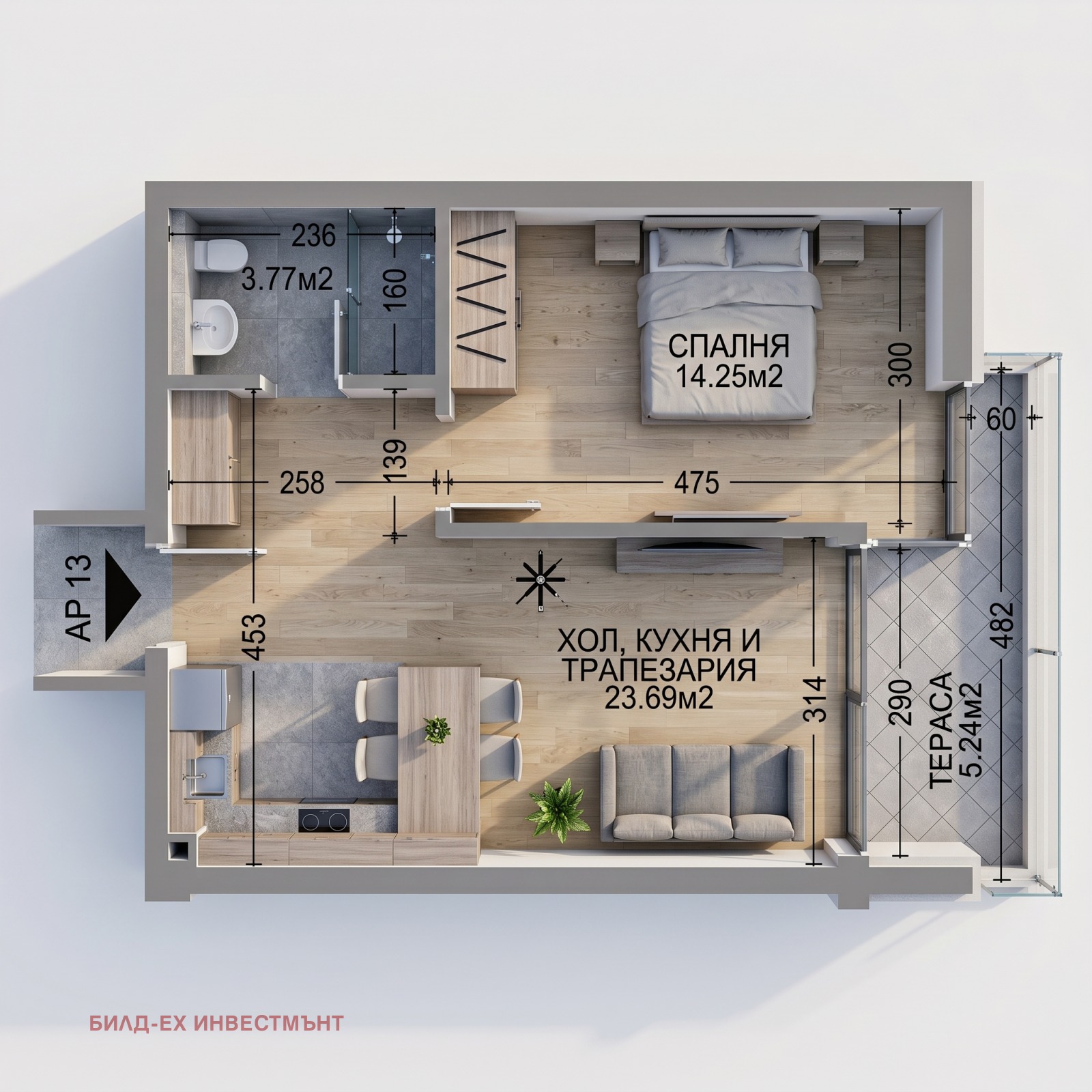 Разпределение на апартамента: Хол с кухненски бокс и трапезария 23.69 кв., спалня 14.25 кв., баня с тоалетна 3.77 кв. и тераса 5.24 кв.