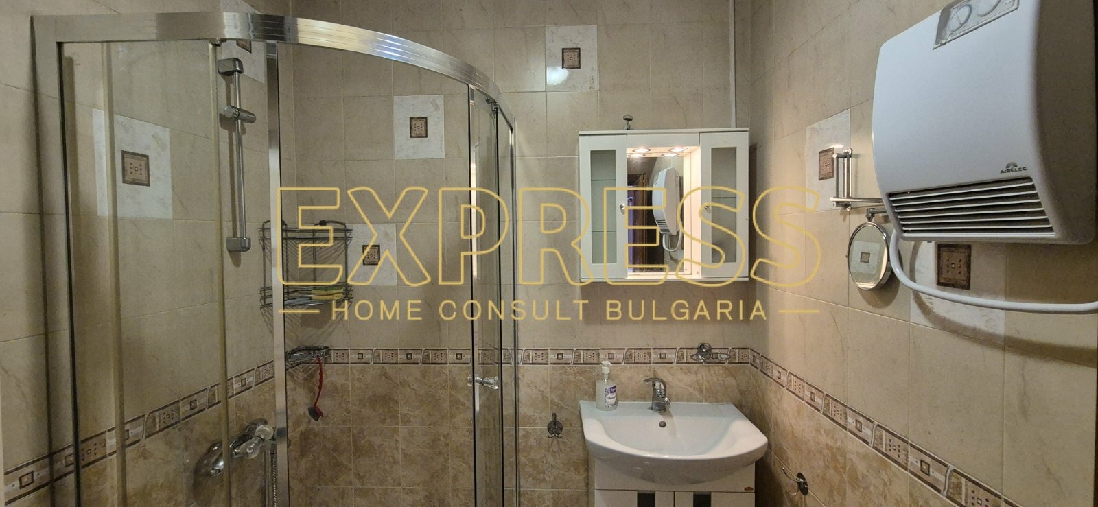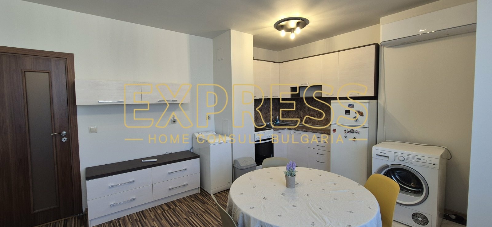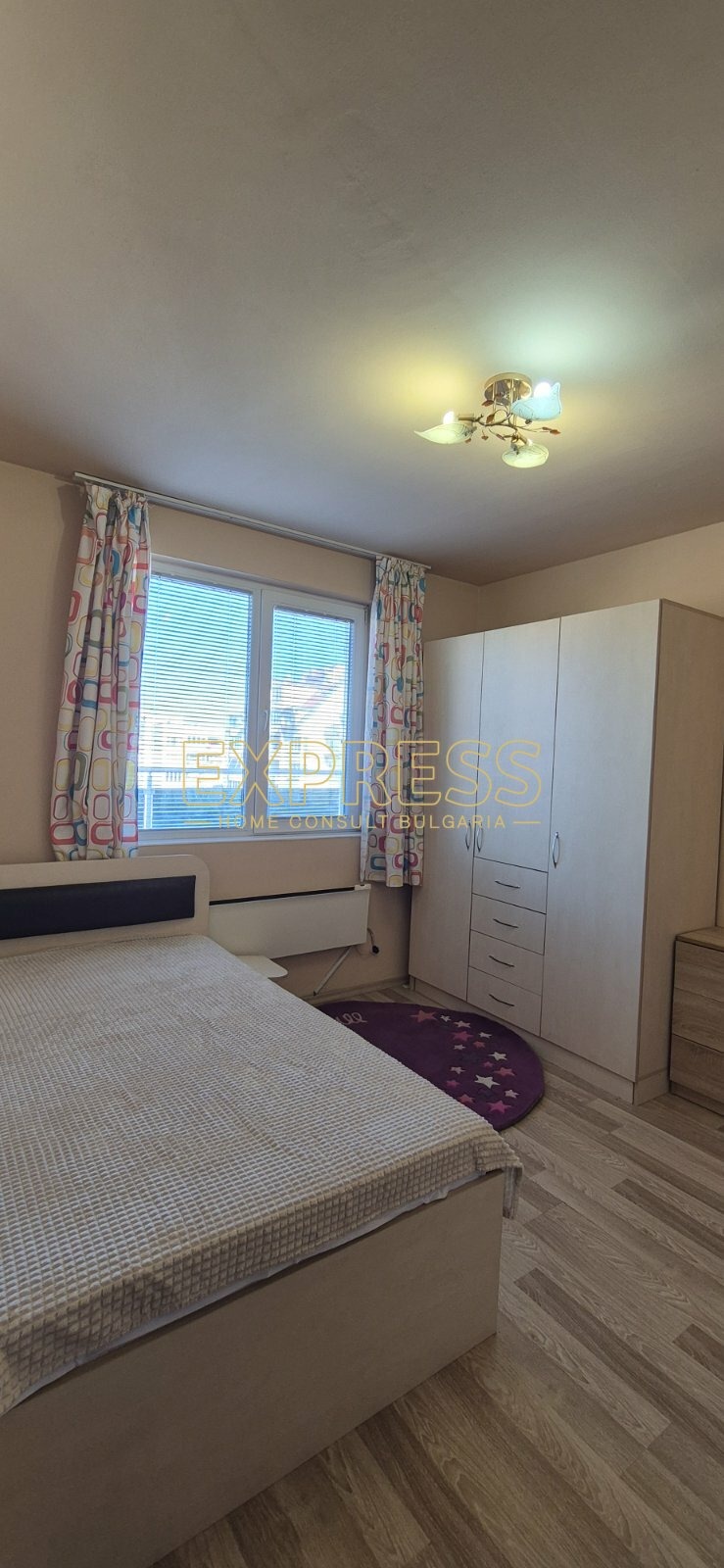 Възможност за наемане на подземно паркомясто !!!! Агенция за недвижими имоти Експрес Дом Консулт България предлага на вашето внимание, панорамен тристаен апартамент в нова сграда с АКТ - 16 на изключително комуникативно място в близост до спирки на градския транспорт, метростанция и Бизнес Парк София. Разпределение: всекидневна с кухненски бокс и трапезария, две спални, баня с тоалетна, тераса. Имотът се отдава напълно обзаведен с инверторен климатик в дневната. Напълно оборудван кухненски бокс, баня с душкабина. Настилки: гранитогрес и ламиниран паркет, стени на латекс. Добри общи части с контролиран достъп и видеонаблюдение. Предимства: Намира се на тихо място в перспективен квартал, в близост до училища, детски градини , множество магазини, хипермаркети, множество офис сгради и Бизнес Парк София. Ниски консумативни разходи и много други екстри.