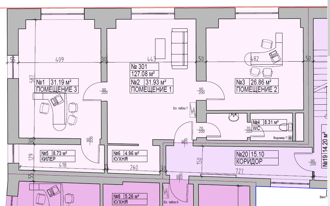 На същия етаж има още един офис с площ 98кв.м. и наем 700 евро без ДДС. Двата офиса са в един коридор и при необходимост от по-голяма площ могат да се наемат и двата.