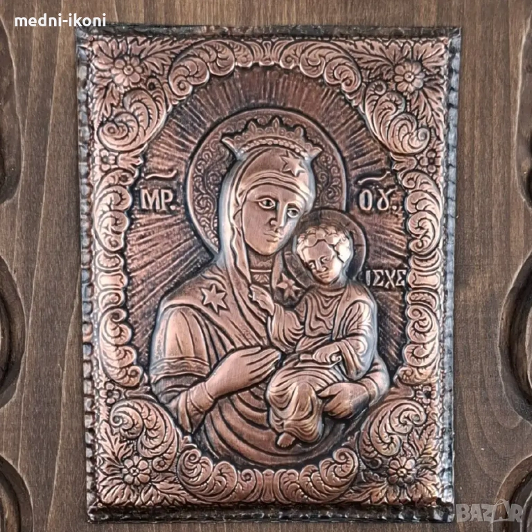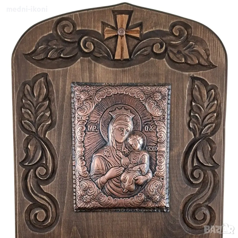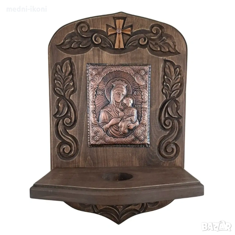 Ръчно изработен дървен иконостас с пластика на Света Богородица Пътеводителка, която е ръчно изработена от чиста медна ламарина. Тази икона е художествена репродукция на средновековна православна икона. На нея е изобразена Божията майка като "Пътеводителка" /Одигитрия/. Това е един от най-древните и разпространени начини за изобразяване на Света Богородица. Света Богородица е покровителка на майките, дома и семейството, пази децата, помага на бездетни, за успех и семейно щастие. Празниците, на които честваме Света Богородица са на 15-ти август - Успение Богородично, на 8-ми септември - Рождение Богородично и на 21-ви ноември - Въведение Богородично. От своя страна, този специален иконостас е направен от липа, байцван е в цвят "орех", след което е изцяло ръчно резбован в красиви форми и кръст в горната си част. Притежава и метална част от задната страна за закачане. Този иконостас е неосветен, защото това е добре да се направи лично, според повода. Подходящ специален подарък е за имен ден, рожден ден, за сватба, за кръщене, за освещаване на дом, за раждане на дете, за семейство, годишнина или ако искаме да пожелаем здраве и семейно щастие. Иконостасът е уникат, не е културна ценност и може да бъде изнасяна извън страната.