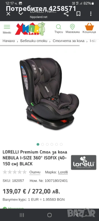 Продаваме детско столче за кола Lorelli в отлично състояние. Върти се на 360 градуса. Подходящо за деца от 40см. до 160см., от 3 до 12 години, до 39кг. Моделът расте заедно с вашето дете. Лесно се монтира за седалката на автомобила. Облегалката също се регулира. Цена 70 Евро. Пращаме по Еконт или Спиди само срещу предварително плащане, за да сме сигурни че ще го вземете и няма да се наложи да си плащаме 2те доставки за да си го вземем обратно.