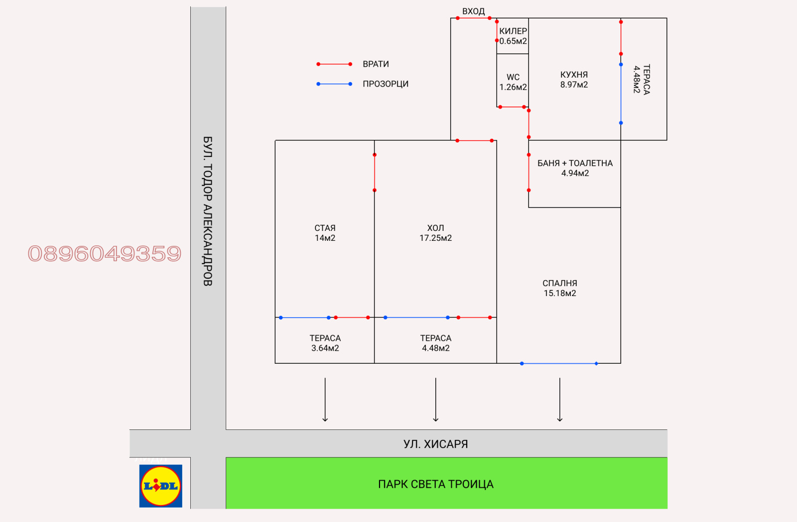 Едно от най-силните предимства на имота е локацията. Блокът се намира точно до парк Света Троица , което осигурява приятна гледка и усещане за простор. В същото време районът е изключително комуникативен метростанция Константин Величков е на около 5 минути, а в близост има и спирки на градски транспорт.