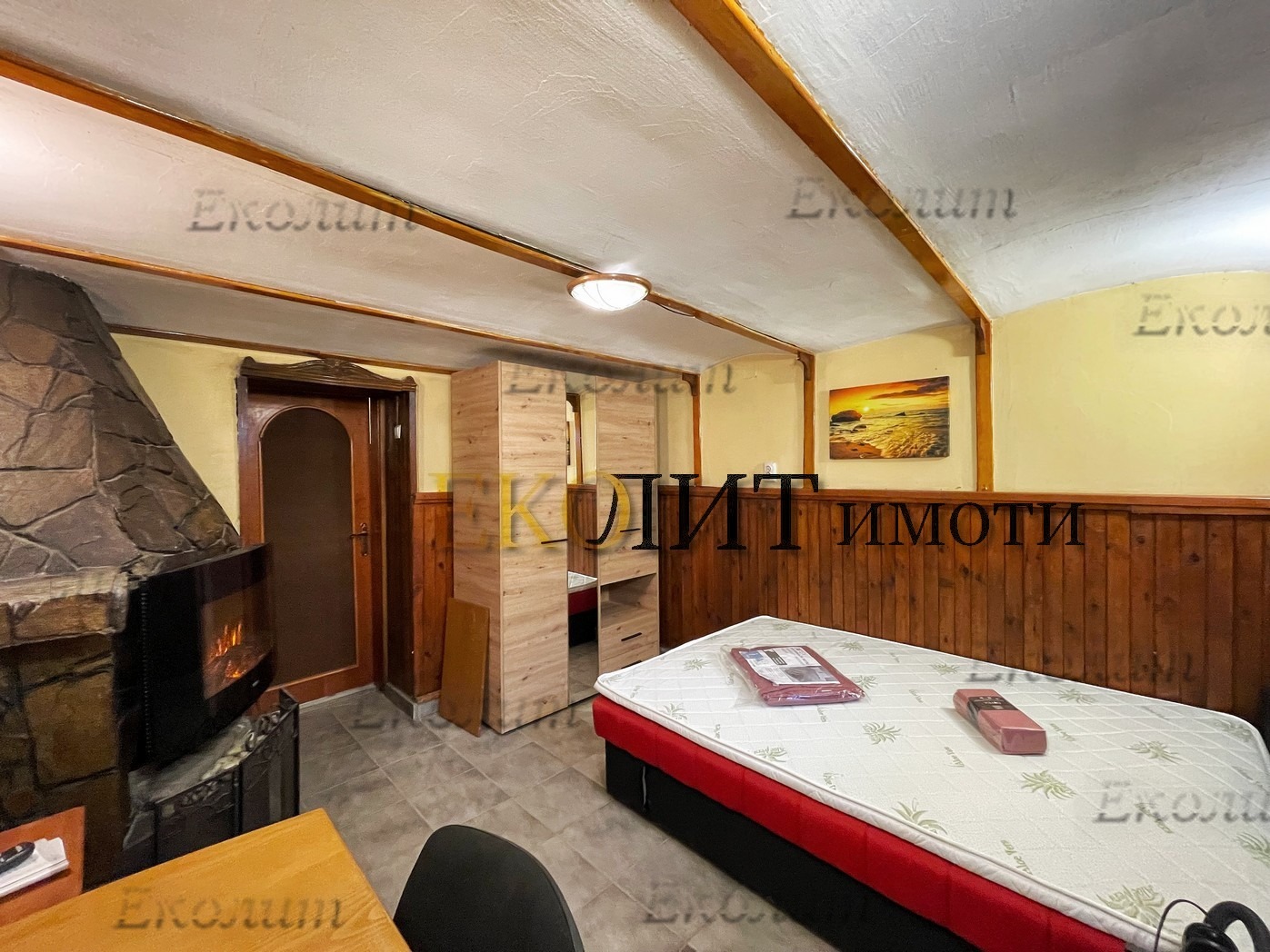 Стая с пълен спален комплект, учебно бюро, декоративна камина, нощно шкафче, голям LED телевизор.
