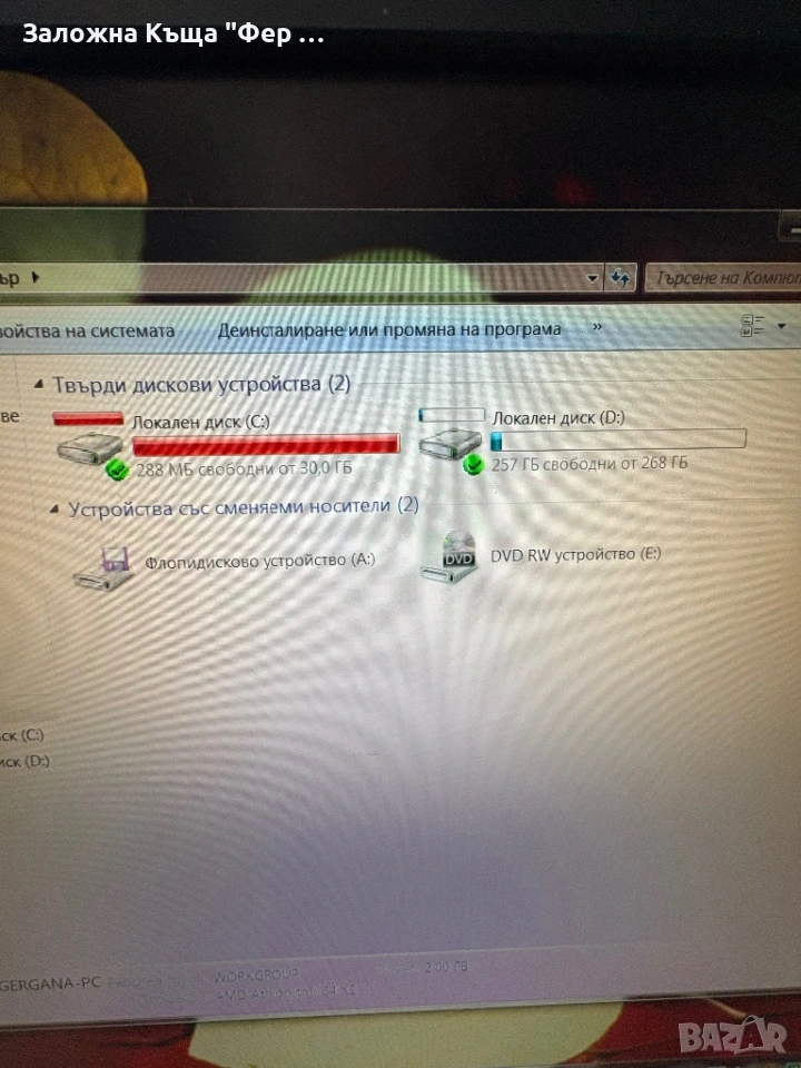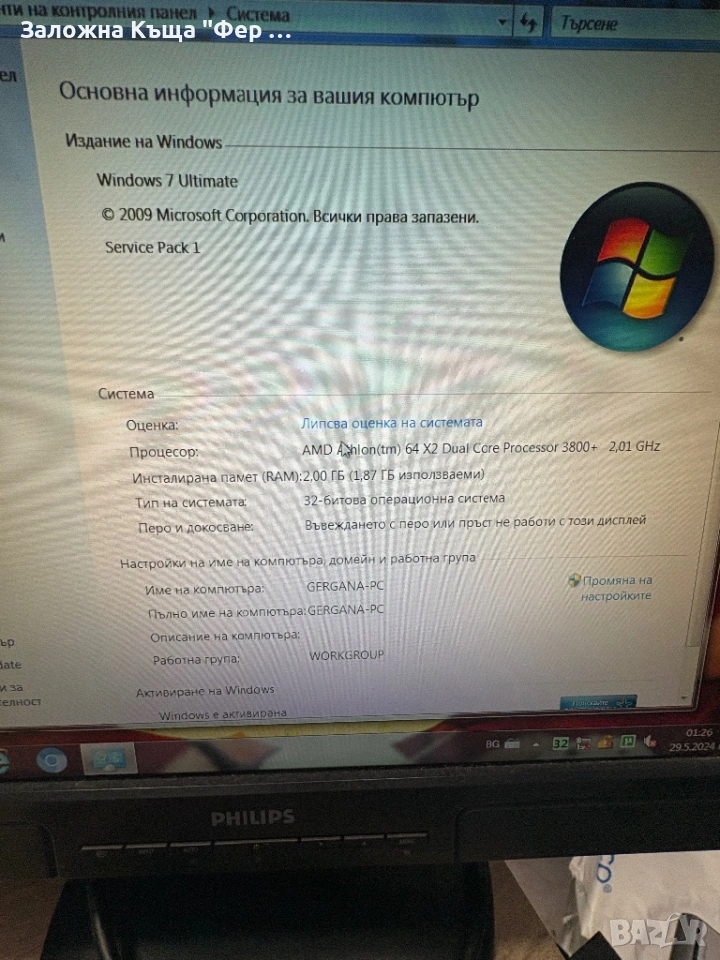 Продавам компютър с монитор Philips 19 инча, клавиатура и мишка. Компютъра е с оригинален Windows 7, има ДВД записвачка, флопи и следни характеристики: