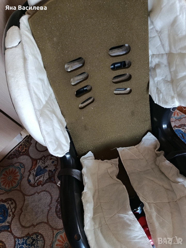Столчето е с изпрани калъфи и колани, има забележки - леко е избелял калъфа от слънцето, стиропора на места е счупен, но се фиксира на място от калъфа. ( на последната снимка).