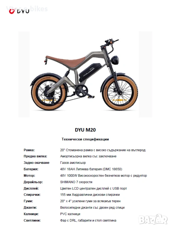 Чисто нов електрически велосипед, тип 'мотопед'. 4 нива на подпомагане (PAS) и ръчка за газ. Пълно окачване със заключваща се вилка. 18Ач. вадеша се батерия и 1000В безчетков хъбов двигател с ограничител до 25 км/ч. Пробег с PAS до 160км (до 100км само на ръчна газ в зависимост от терена и теглото на водача). 7 скорости с SHIMANO дерайльор. LED фар, габарит и стоп светлини. USB за зареждане на уреди, стартиране с NFC карта, круз контрол и достъп до меню за дълбоки настройки. До 120 кг.