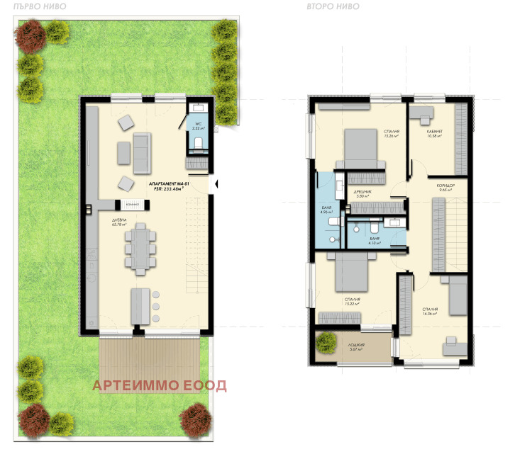 Комплексът разполага с мезонети и апартаменти с площ от 108 до 250 кв. м.