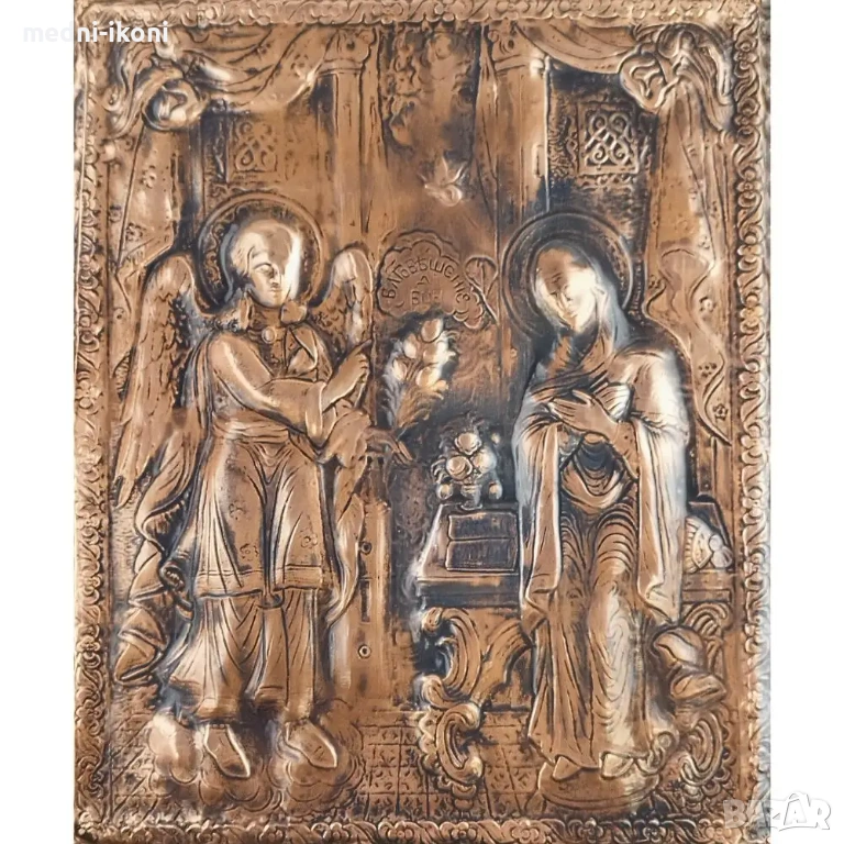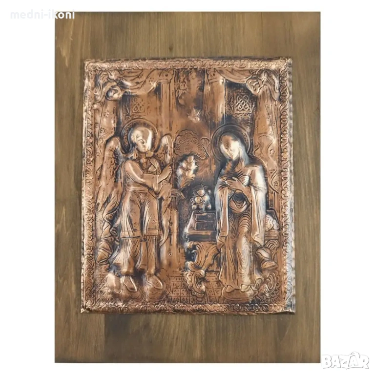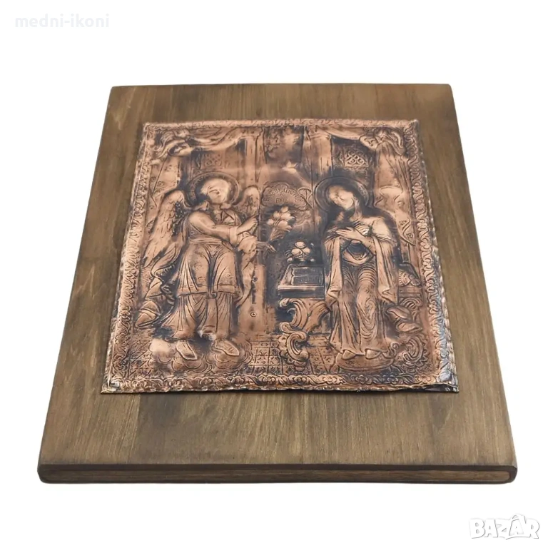 "орех".Тази голяма икона е художествена репродукция на средновековна православна икона. На нея е изобразено едно от най-светлите събития за християните - Благовещение. Според Библията на този ден Архангел Гавриил съобщава на Дева Мария благата вест, че тя ще роди Спасителя на човечеството, сина Божий - Иисус Христос. Подходящ подарък е за рожден ден, имен ден, сватба, кръщене, за майка, раждане на дете, нов дом и за всякакъв друг вид повод или празник. Помага при всякакви трудности, пази от лоши мисли, загуби и зли сили. Носи здраве, смирение и благоденствие на цялото семейство. Всяка една икона е уникат, притежава сертификат за автентичност, не е културна ценност и може да бъде изнасяна извън страната.