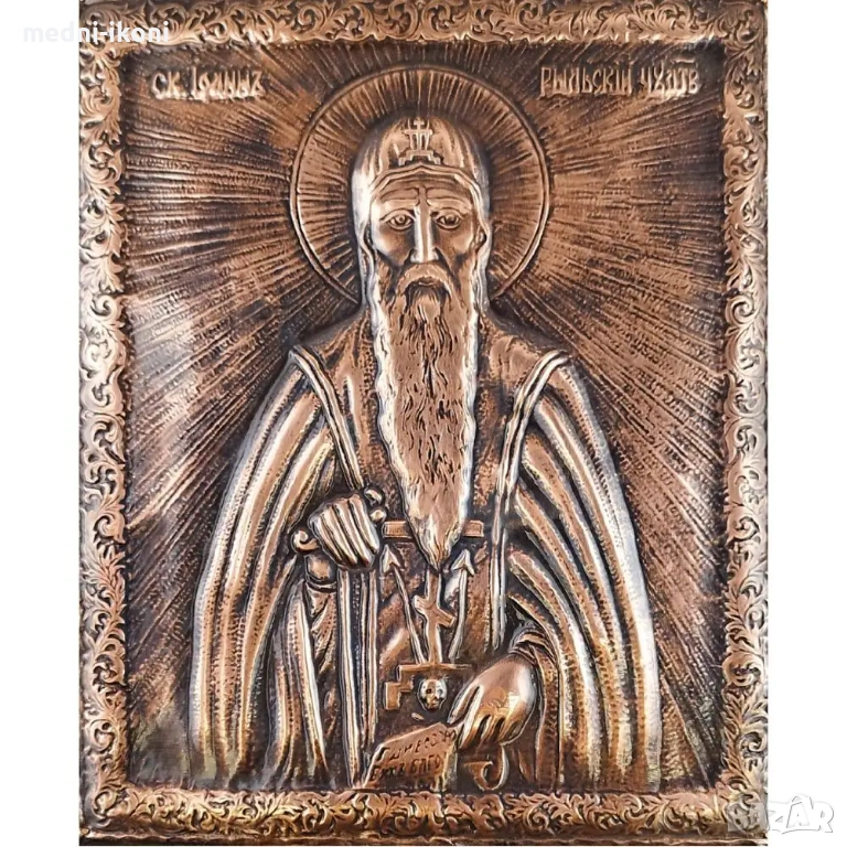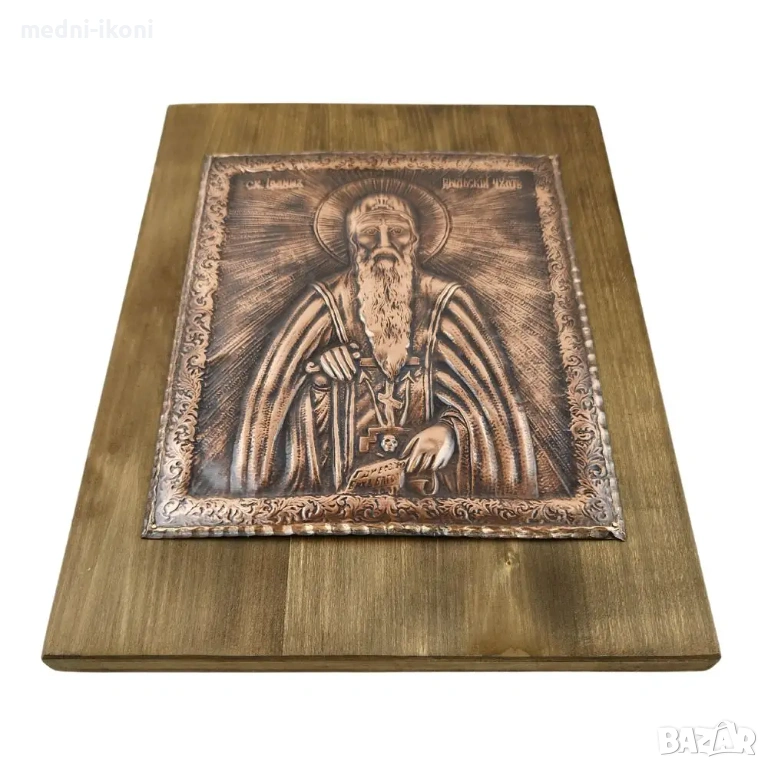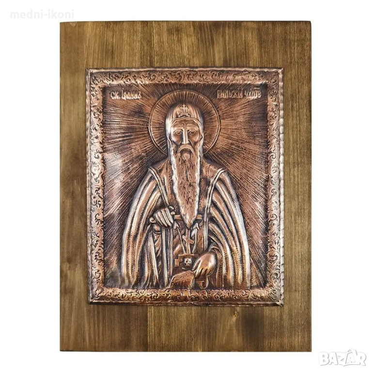 "орех". Тази икона е художествена репродукция на средновековна православна икона. На нея е изобразен с ореол Свети Преподобни Йоан Рилски Чудотворец. Той е български духовник и монах, който е живял в отшелничество и е извършил множество чудеса. Смята се за небесен закрилник и покровител на българския народ и медиците, патрон на будителите и основател на Рилския манастир. Празника му честваме на 19-ти октомври. Подходящ подарък е за лекар, за имен ден, рожден ден, сватба, нов дом, за офис, за пожелание за дете, за семейство, за кръщене, за благодарност и здраве.