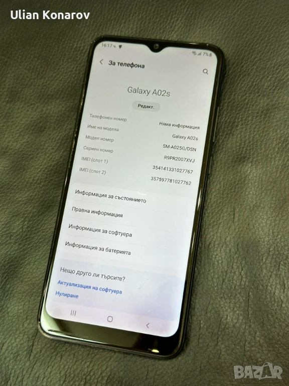 Продавам Samsung Galaxy A02s в много добро състояние. Телефонът е запазен, работи без забавяне и няма технически проблеми. Подходящ за ежедневна употреба – разговори, социални мрежи, YouTube и основни приложения.