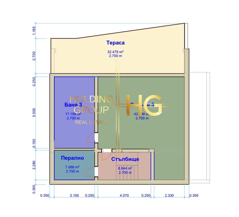 трети етаж представлява голяма спалня 43 кв.м. с ниша за гардеробна, баня и тоалетна 17 кв.м., санитарно помещение и голяма панорамна тераса