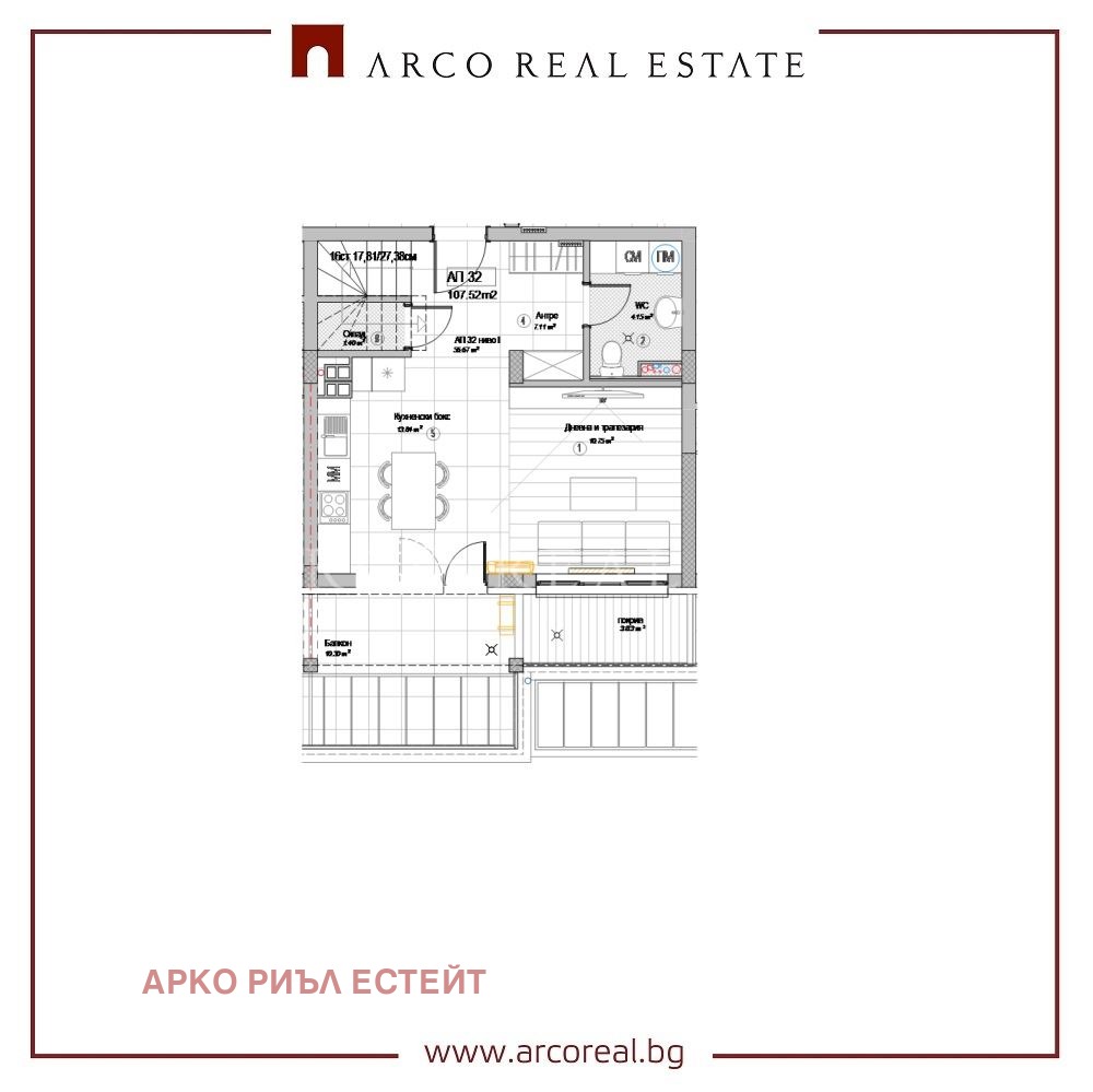 Апартамент 32 е със застроена площ 107.52 кв.м. на ет.5 и 6.