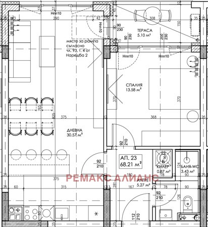 Има следното разпределение дневна с кухненски бокс 30.57 кв. м, спалня 13.58 кв. м, баня с тоалетна 3.43 кв. м, килер 0.87 кв. м, балкон 5.10 кв. м и антре 5.27 кв. м.