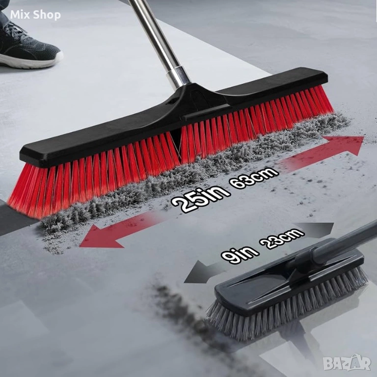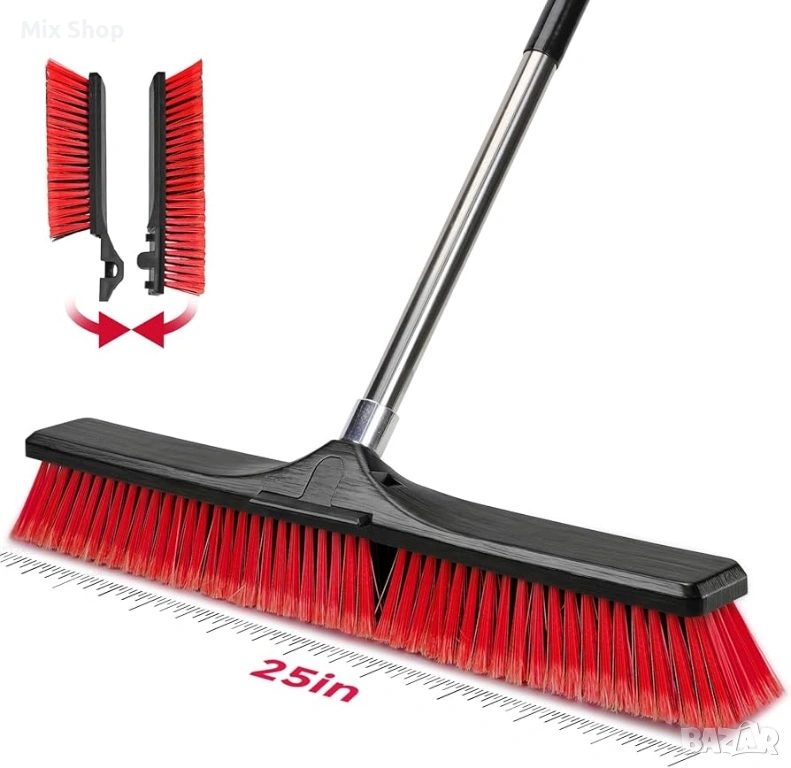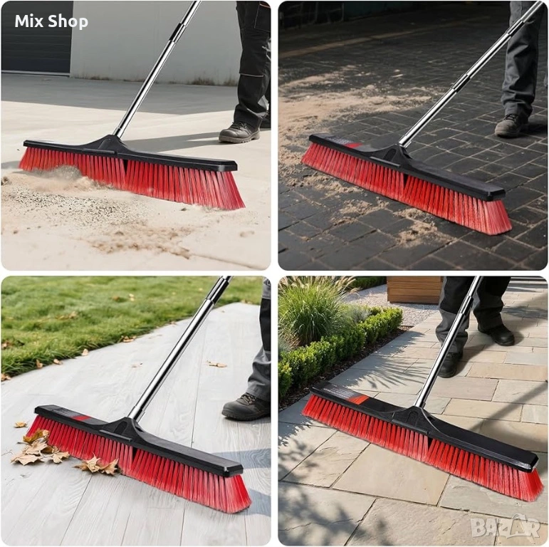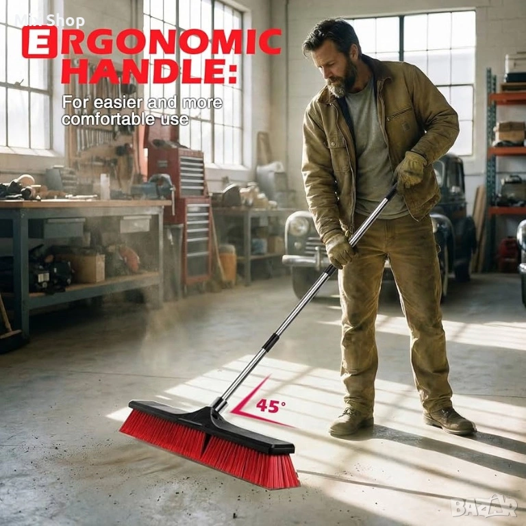 Ергономичен дизайн 45°: Главата на метлата за открито е наклонена под ъгъл от 45° спрямо пода, което ви помага лесно да достигнете до ъглите. Също така намалява болката в коленете и гърба, докато вършите домакинска работа. По-лесна е за бутане от изправените метли, което прави почистването ви по-ефективно.