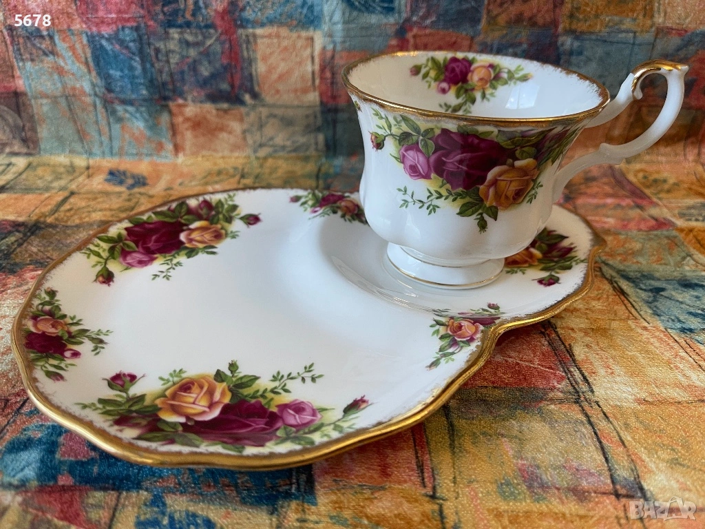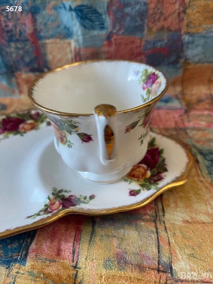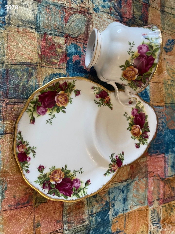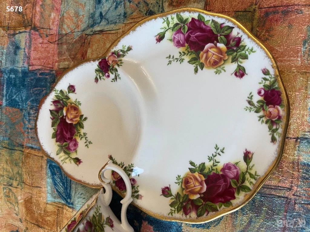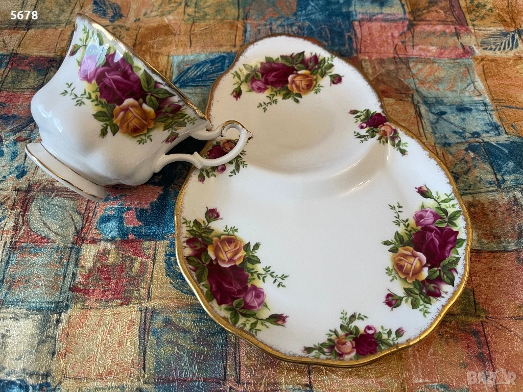 Порцеланов сет за закуска на Royal Albert, от серията “Old Country Roses”, England. В отлично състояние. Дължина на подноса 22 см.
