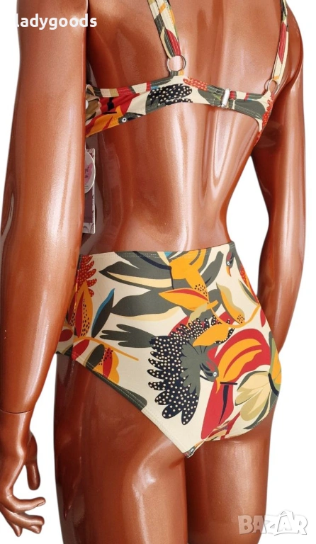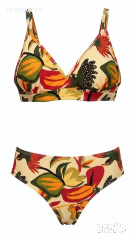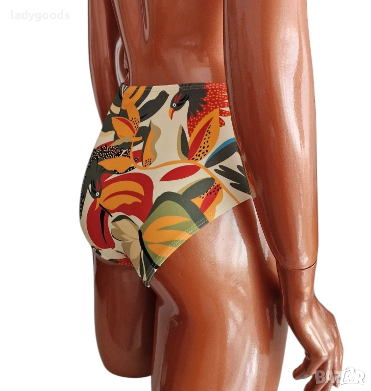 Бански костюм с мека чашка и дълбока талия.Горната част е с закопчаване на гърба,а презрамките се регулират.В чашката има малки подплънки,които ако не са ви необходими може лесно да се извадят.