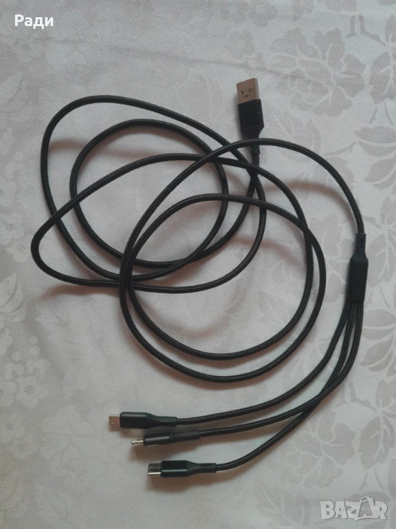 Мултифункционален кабел за зареждане на телефони и др. с три накрайника.