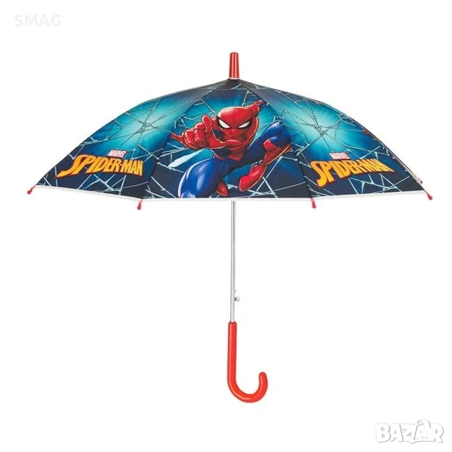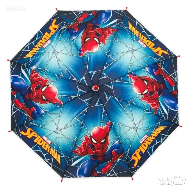 Детски чадър за момчета в син и червен цвят с дизайн Spiderman. Оборудван е с извита дръжка и удобен механизъм за автоматично отваряне. Дължина на чадъра е 63 см, а диаметърът в отворено състояние достига 80 см.