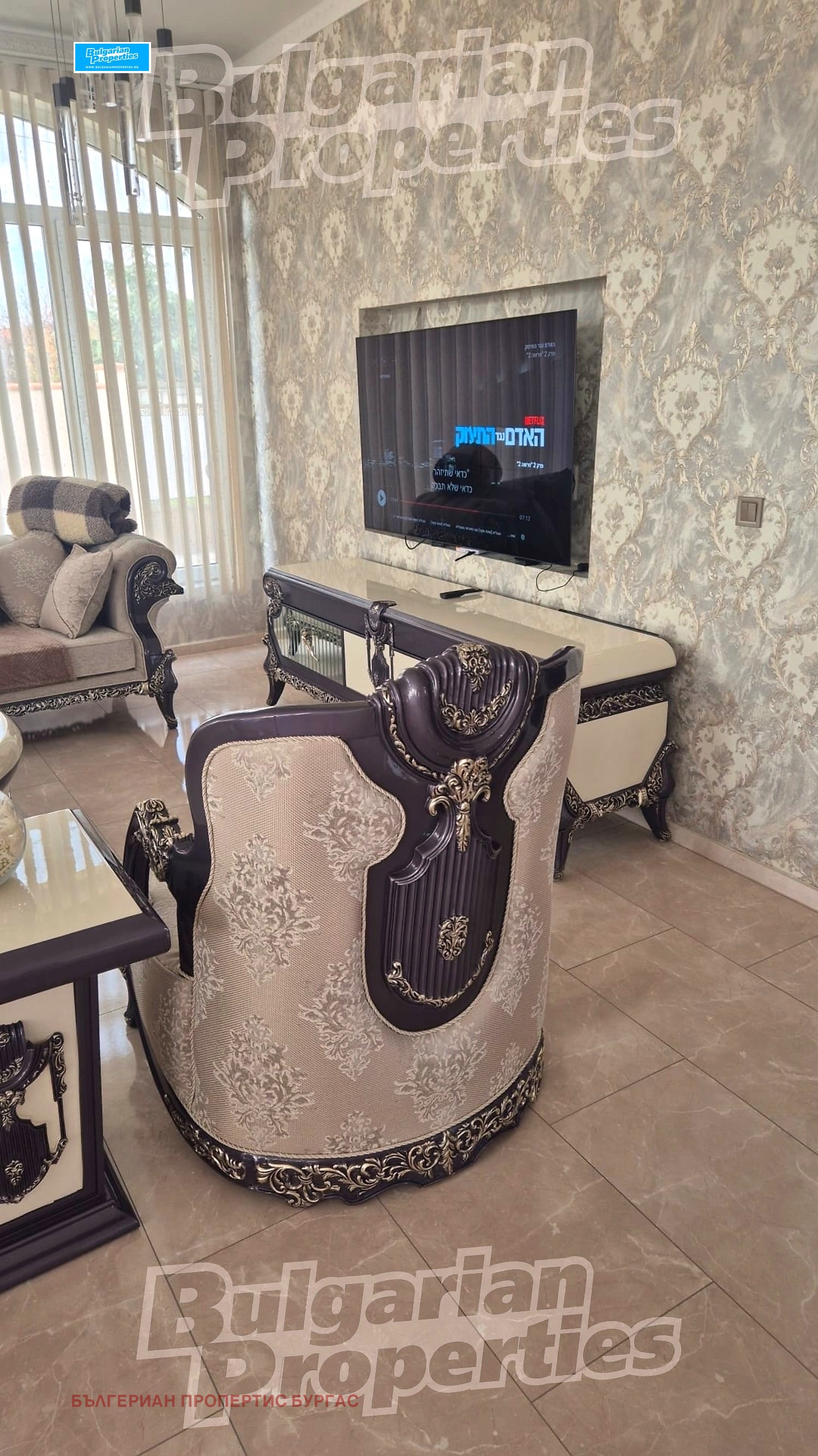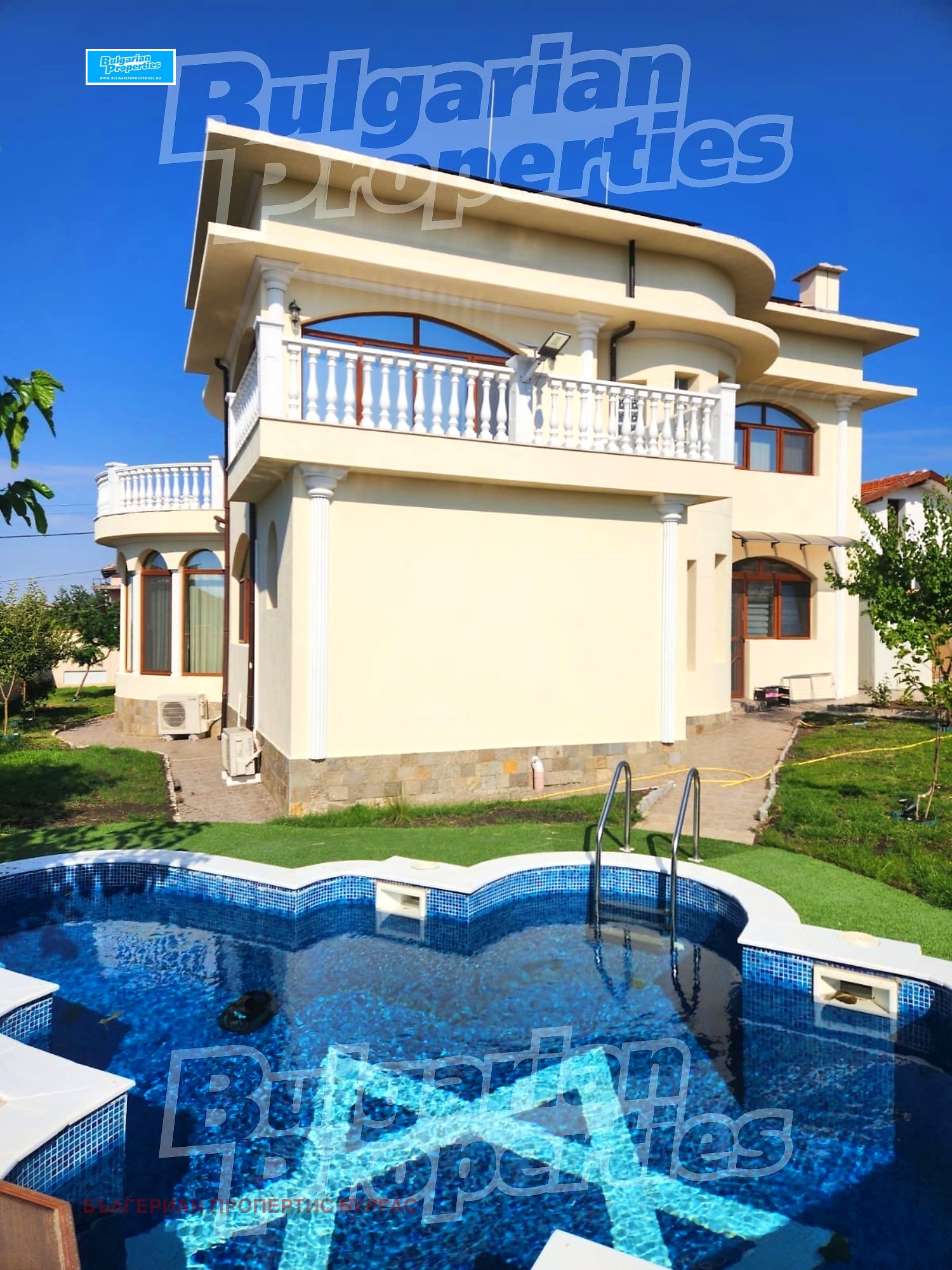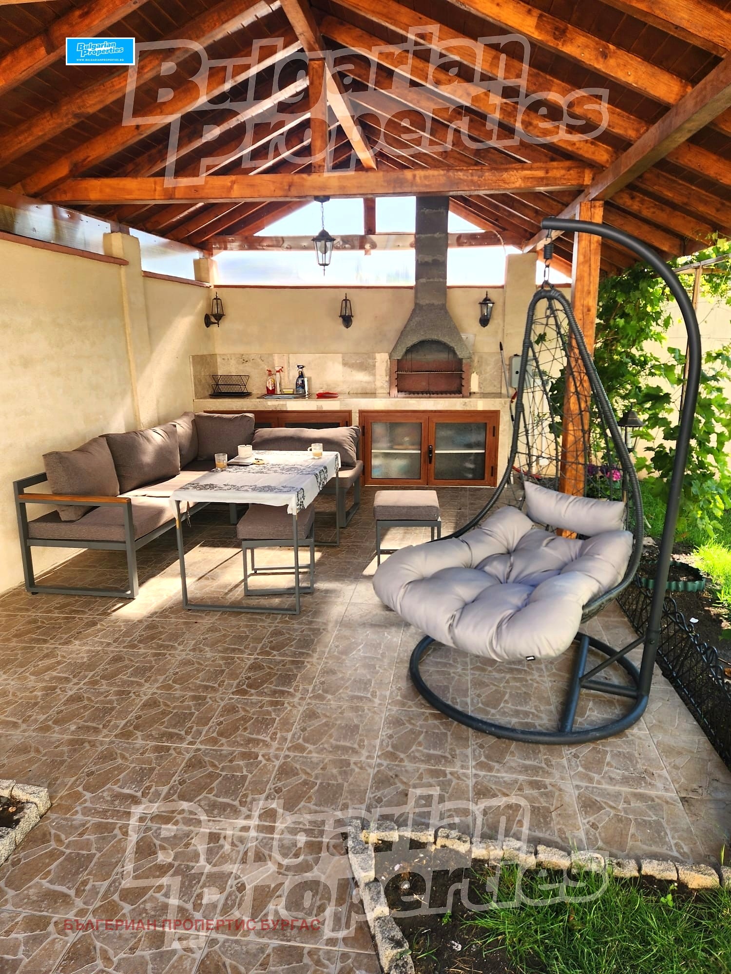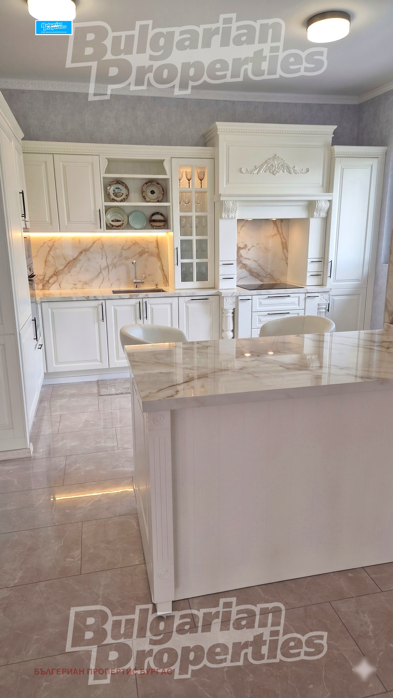 Къщата се продава напълно обзаведена с висок клас италиански мебели от масивно дърво. Кухнята е напълно оборудвана с вградени електроуреди хладилник, съдомиялна машина, печка с котлони. Имотът е с Акт 16 и е готов за незабавно нанасяне.
