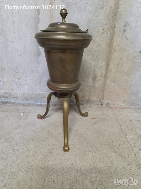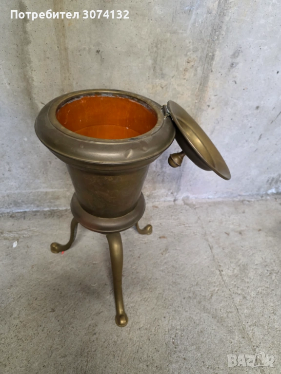 Старинна бронзова кадилница с оранжев вътрешен цвят. Тя е с характерен стар дизайн и патинирана повърхност, което й придава уникален и автентичен вид. Кадилницата е в добро състояние и може да бъде използвана за декоративни цели или за ароматерапия.