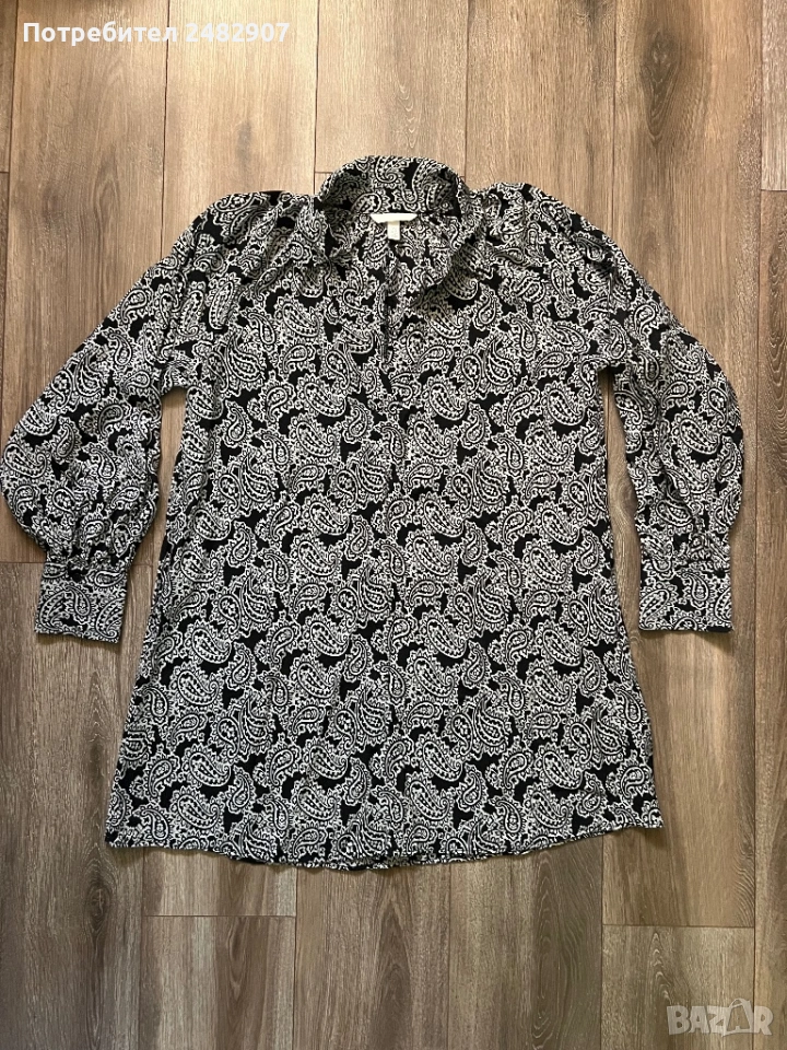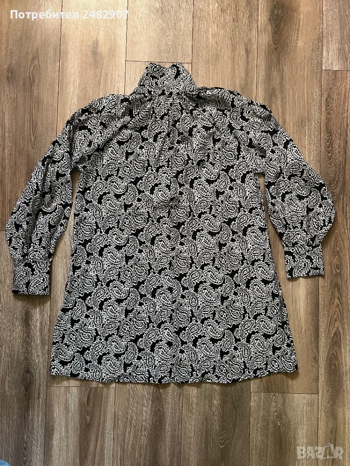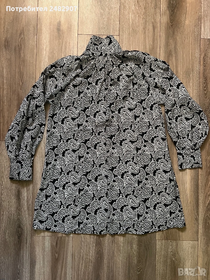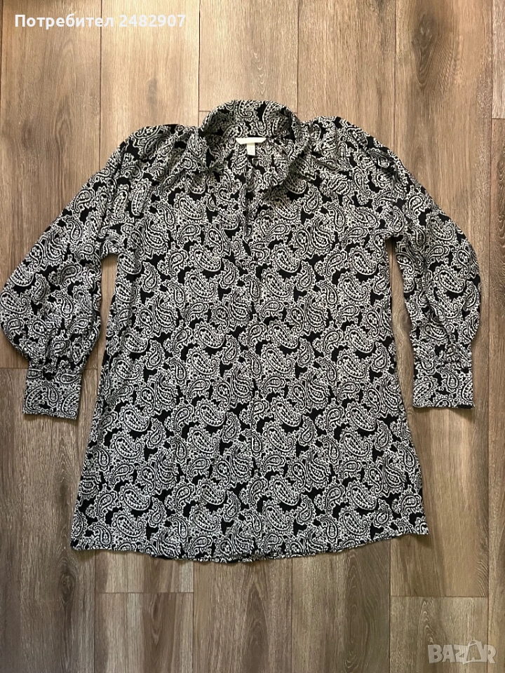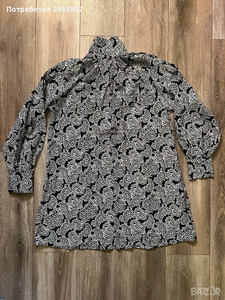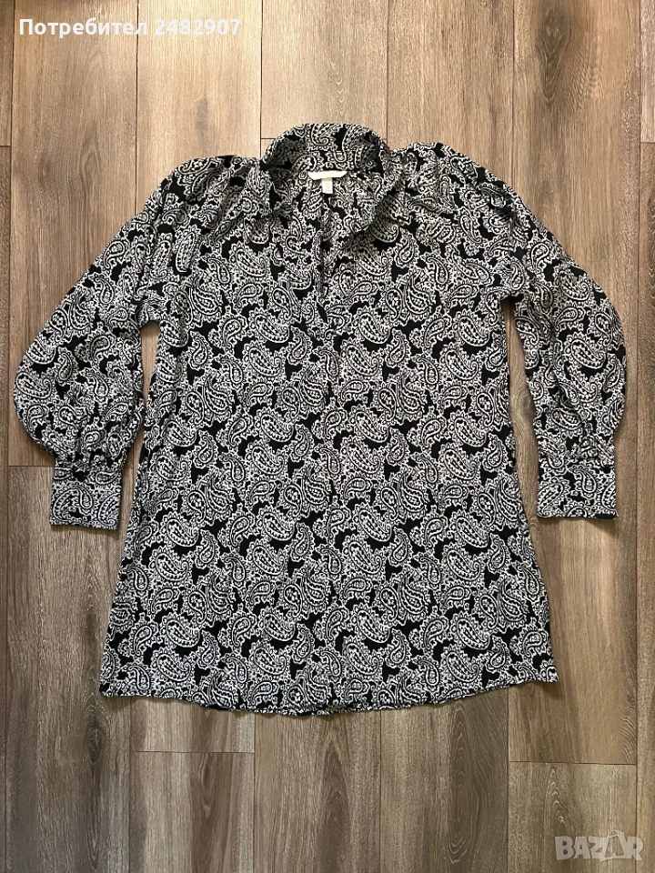Дамска риза/Туника в черно и бяло, размер XXL. (по етикет - XS). Съдържа 77 % вискоза и 23 % полиамид. Ширина под мишниците - 57 см, ширина в долната част - 73 см, дължина от рамото до долу - 85 см, дължина на ръкава от яката - 74 см, ширина на ръкава в долната част - 12 см. Чисто нова, не е използвана.