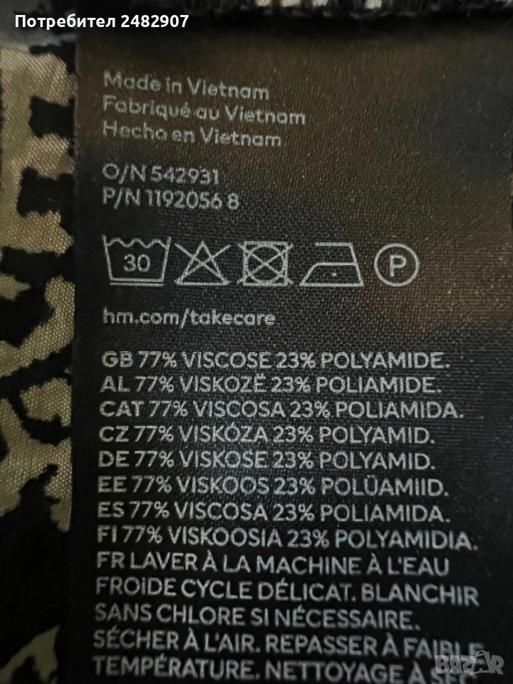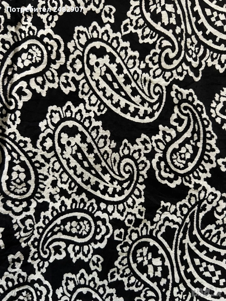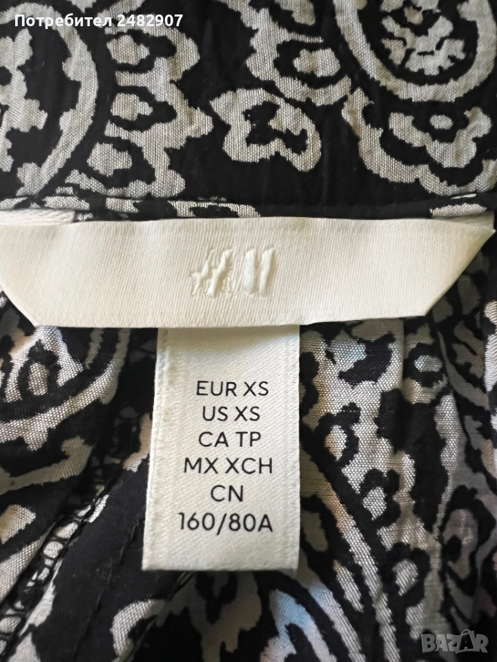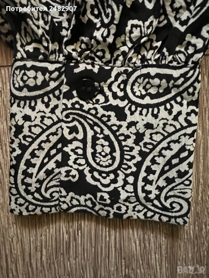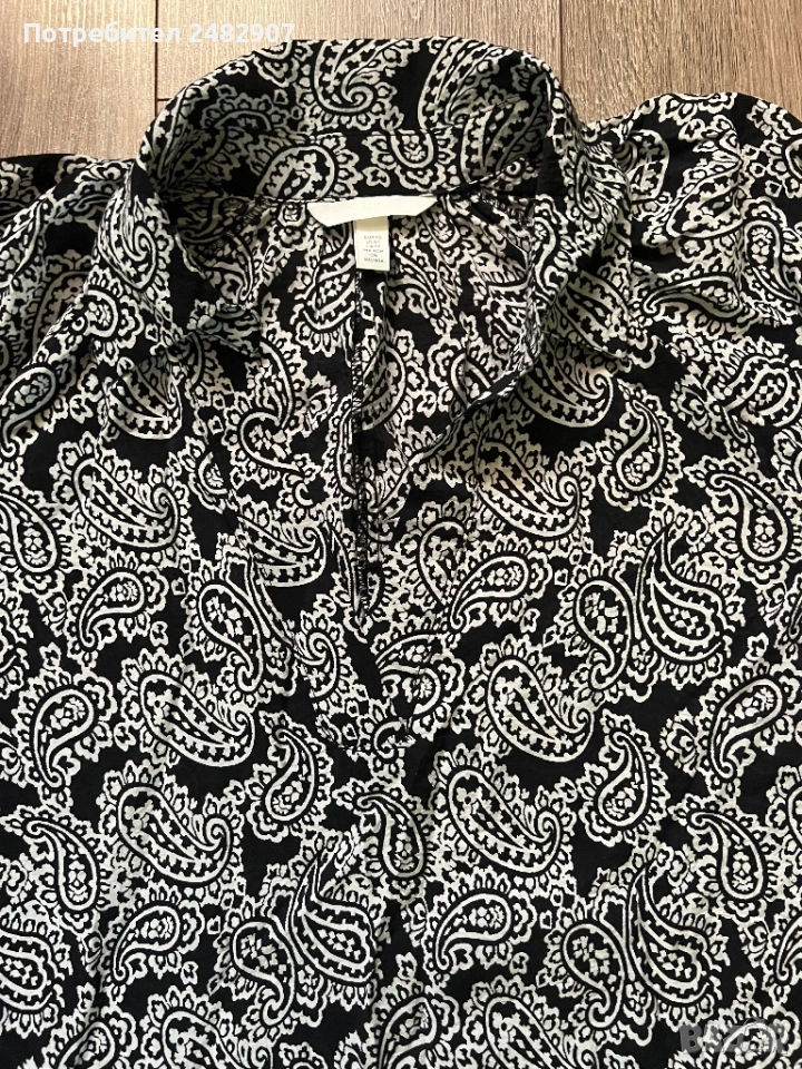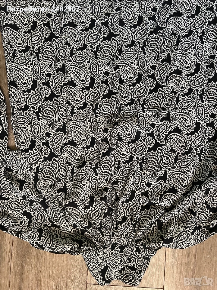 Дамска риза/Туника в черно и бяло, размер XXL. (по етикет - XS). Съдържа 77 % вискоза и 23 % полиамид. Ширина под мишниците - 57 см, ширина в долната част - 73 см, дължина от рамото до долу - 85 см, дължина на ръкава от яката - 74 см, ширина на ръкава в долната част - 12 см. Чисто нова, не е използвана.