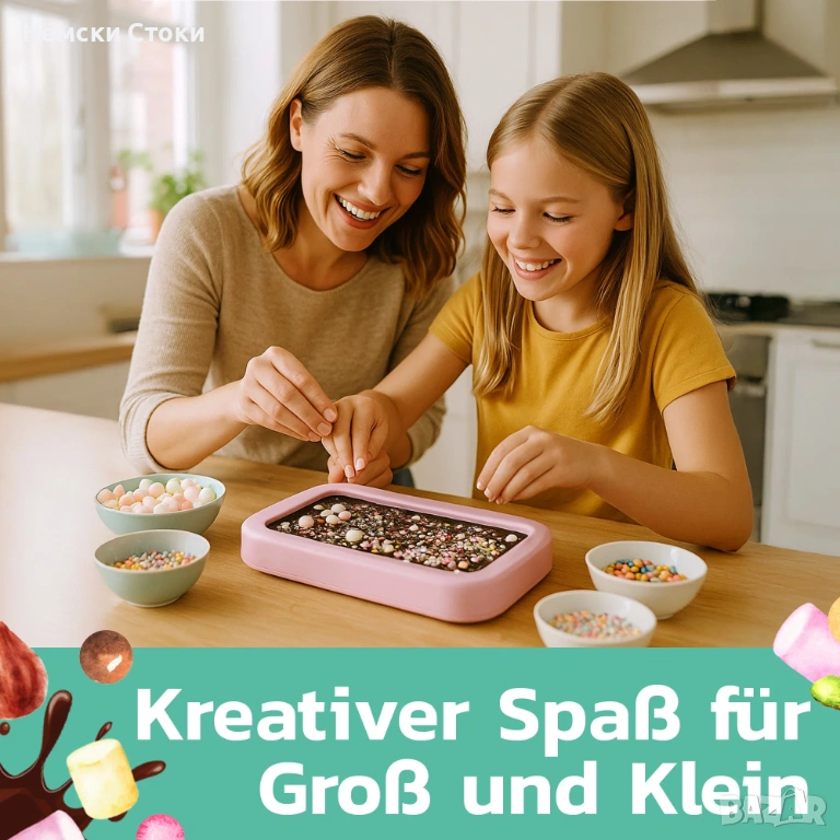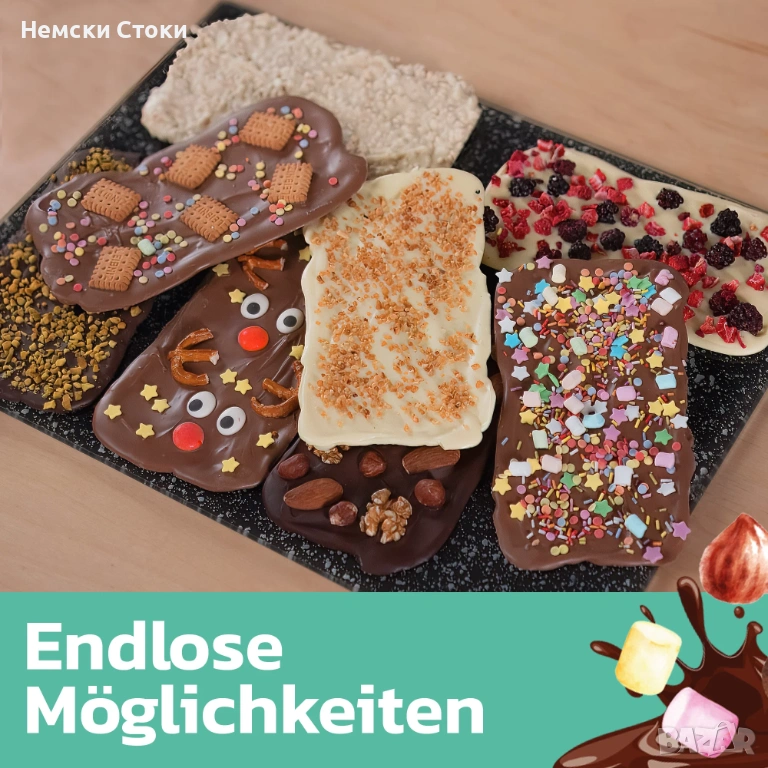 Подобрете своя творчески „Направи си сам“ проект с гарнитури като ядки, сушени плодове, шоколадови парченца, парченца карамел, зърнени храни и много други или направете шоколада класически в стил Дубайски шоколад със съставки като шамфъстък, кадаиф и сусамови семена.
