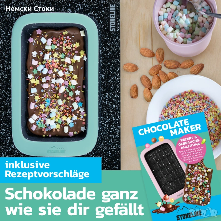 Предимството пред други силиконови форми за шоколад: Благодарение на охлаждащата течност вътре в шоколадопроизводителя STONELINE, не е нужно да чакате дълго, за да се насладите на домашно приготвените си лакомства. Тя охлажда преди това течния шоколад за минути. Почистването също е много лесно: използвайте мека гъба и избършете формата с хладка вода. След това подсушете добре.