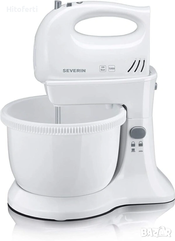 - Съдържание на кутията: 1 комплект ръчен миксер SEVERIN, вкл. стойка за маса, купа за смесване, 2 бъркалки и 2 куки за тесто, HM 3810, размери (Д x Ш x В): 29 x 20 x 34 см, обем: 3 л, тегло: 1,8 кг, цвят: бял/сребрист