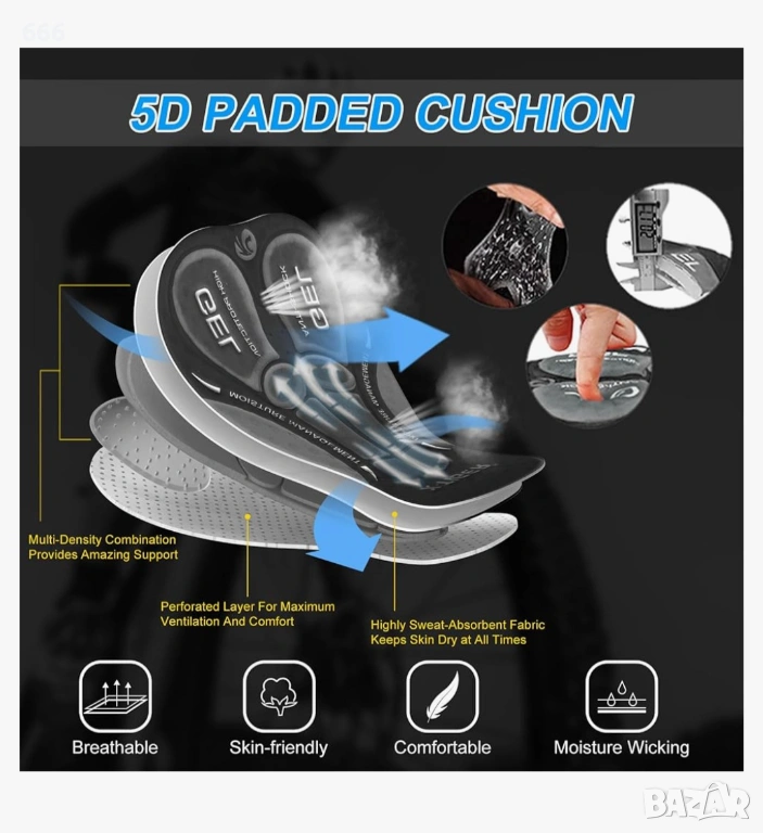 5D подплънки: Това мъжко колоездачно бельо е с 5D гел подплънки, които ефективно омекотяват ударите и намаляват натиска и болката в седалището. То предлага ергономично, меко и удобно прилягане за дълги пътувания.