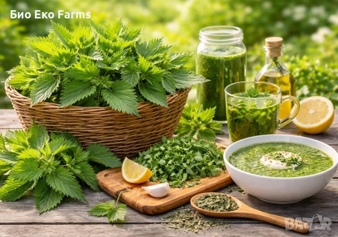 Свежа горска коприва, тесто за мекици от добруджанска хлебна пшеница с подчертан вкус.